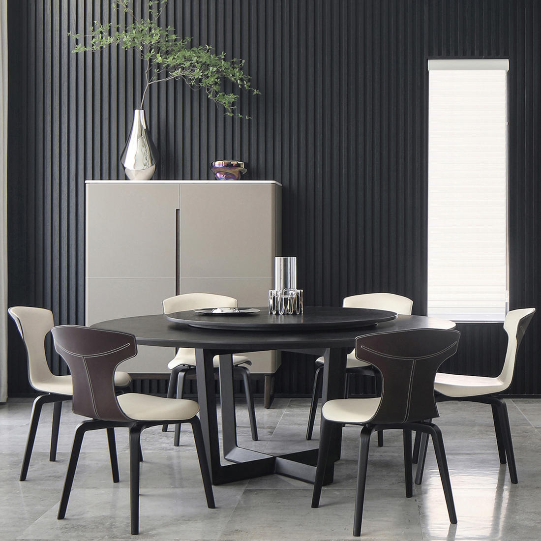 The tabletop pairs large-format wood tiles in matching veneer, arranged in a distinctive cross-grain pattern that reveals subtle tonal variations. A removable Lazy Susan in layered wood rests atop the surface, enhancing both functionality and symmetry. Bolero brings understated elegance and contemporary Italian design language to dining spaces shaped by material integrity.
