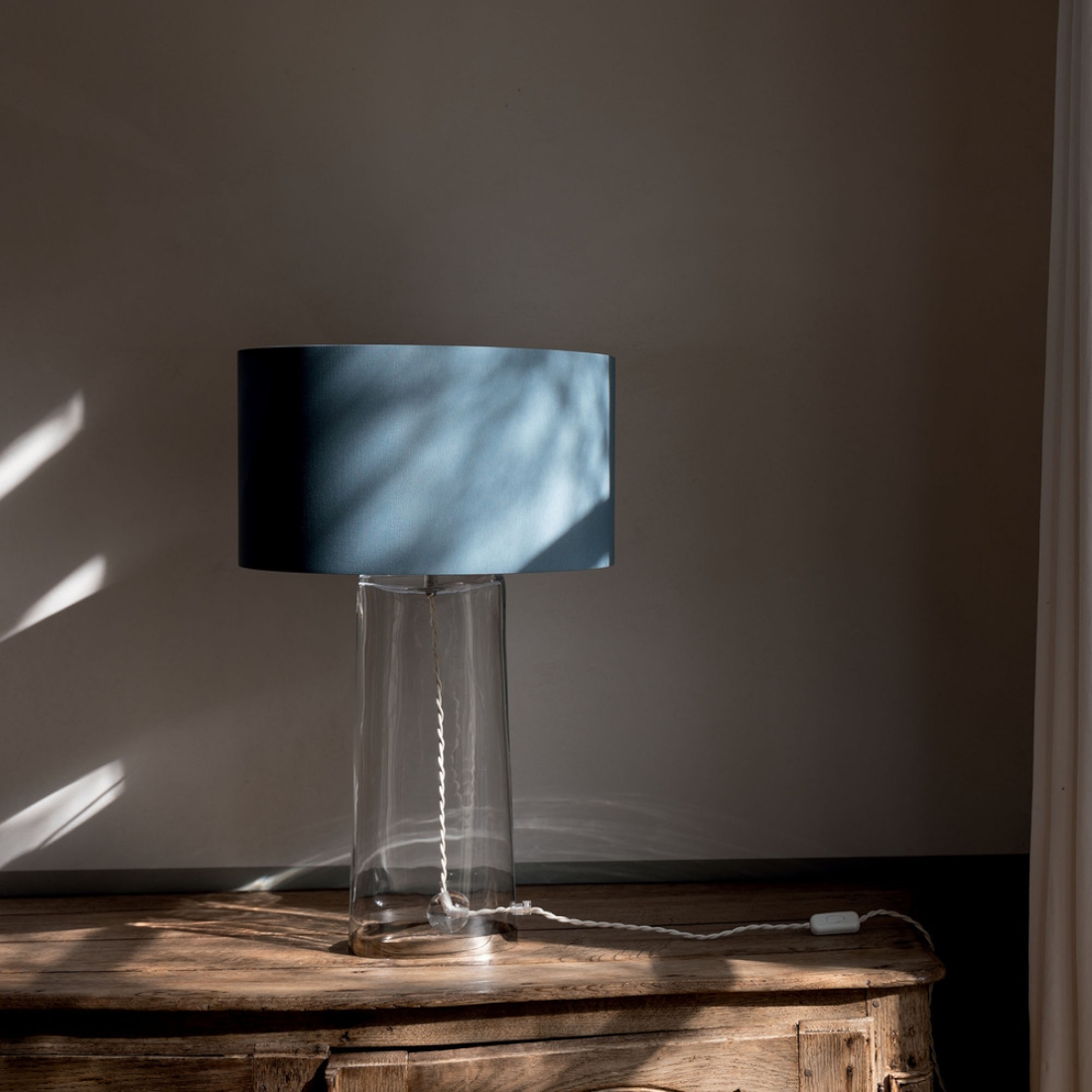 Handcrafted by Venetian artisans, each piece reflects the heritage of Italian glassmaking, paired with a curved lampshade in Pearl, Stone, or Dark Blue Grey. Part of the Alma, Dido, Fede, and Holly lighting series, it casts a soft, ambient glow—elevating bedside tables, consoles, or curated reading corners with enduring elegance and artisanal intent.