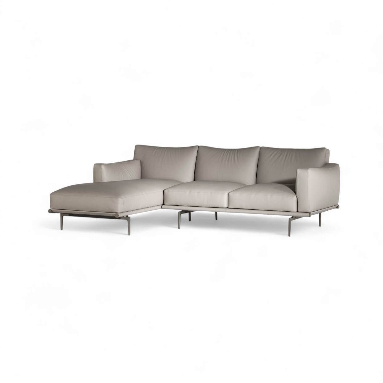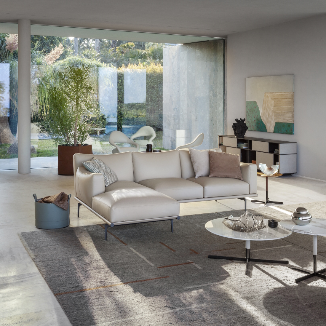 Sculptural in form and refined in proportion, the Happy Jack corner sofa by Poltrona Frau introduces architectural clarity to contemporary interiors. Elevated on an aluminium base, its softly contoured silhouette flows effortlessly into the integrated chaise longue, offering extended seating and visual lightness across open-plan spaces.