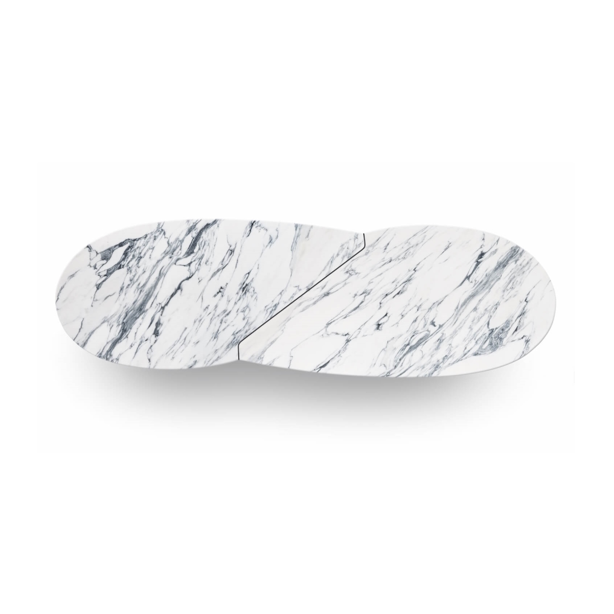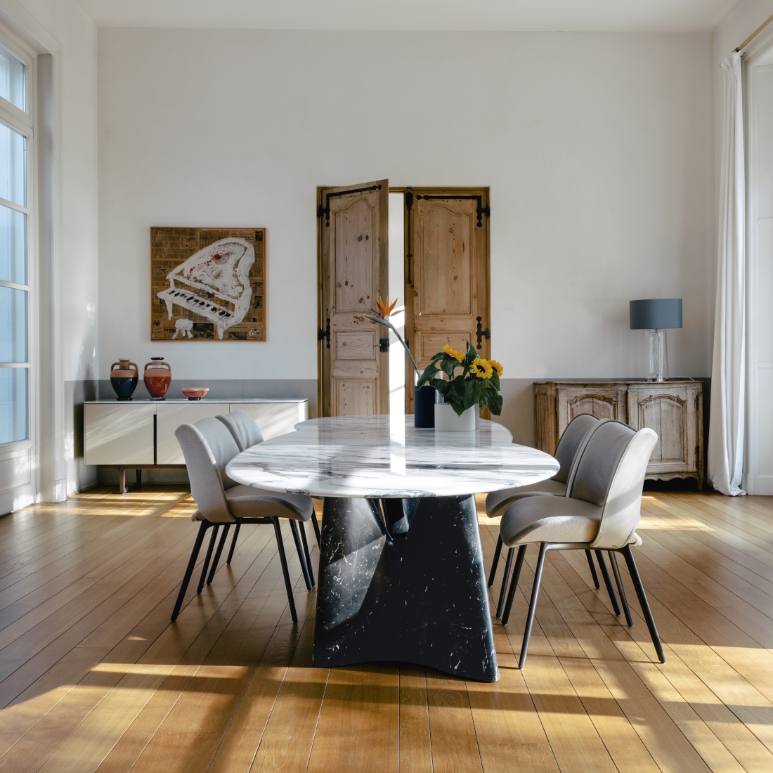 A sculptural expression of craftsmanship and rarity, the Infinitamente dining table by Poltrona Frau transforms natural stone into functional art. Designed by Roberto Lazzeroni, its staggered double-oval top in polished Bianco Levigliani marble is joined by a stainless steel blade insert—subtly marking the meeting point of precision and organic form.