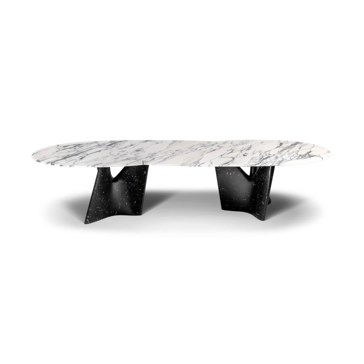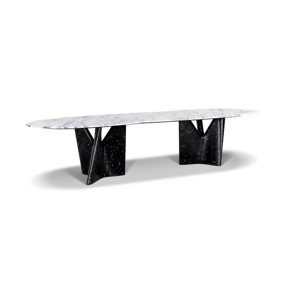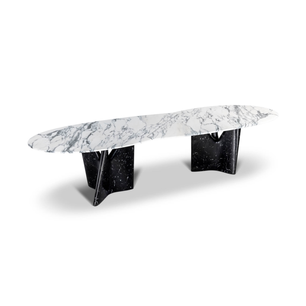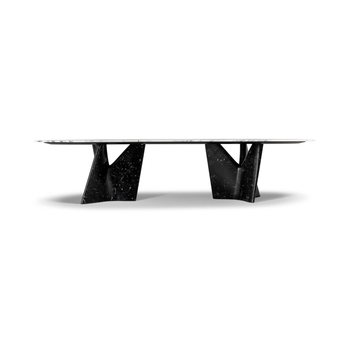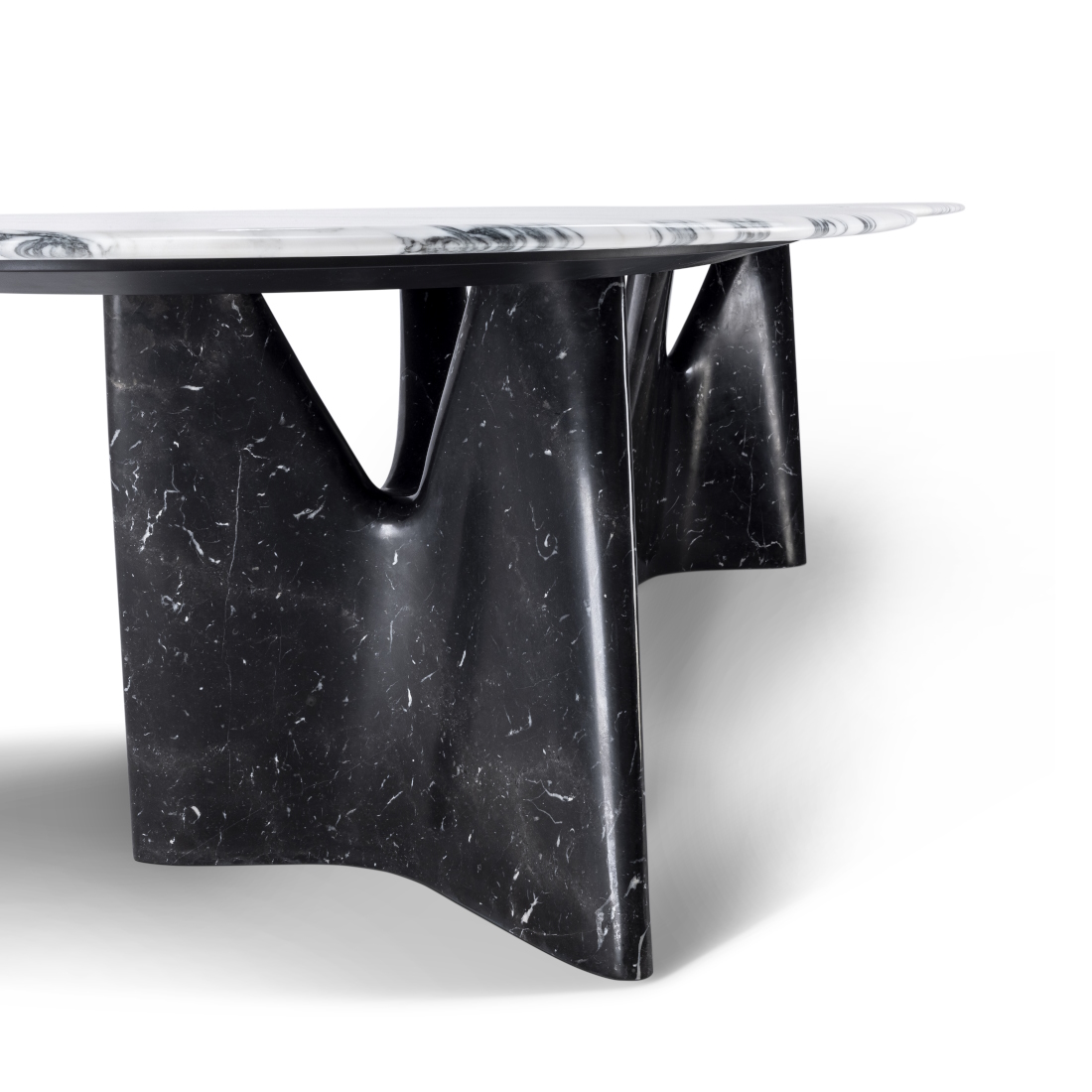 The base is crafted from black Marquinia marble, formed from a monolith sculpted using CNC machines and refined by hand. The base features a white plastic slide at the bottom for protection. The oval table is supported by a single base, while the “∞” shaped table features two bases for added structure.