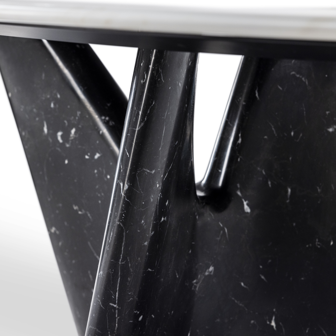 Warning: The particular processing of the Infinitely tables’ bases, executed with CNC machines and finished by hand, may result in halos in different shades of gray compared to the black color of the marble, as well as areas of varying brightness. These color variations are a natural and intrinsic characteristic of the stone, revealing the mineral inclusions that have contributed to the creation of this unique marble over centuries.