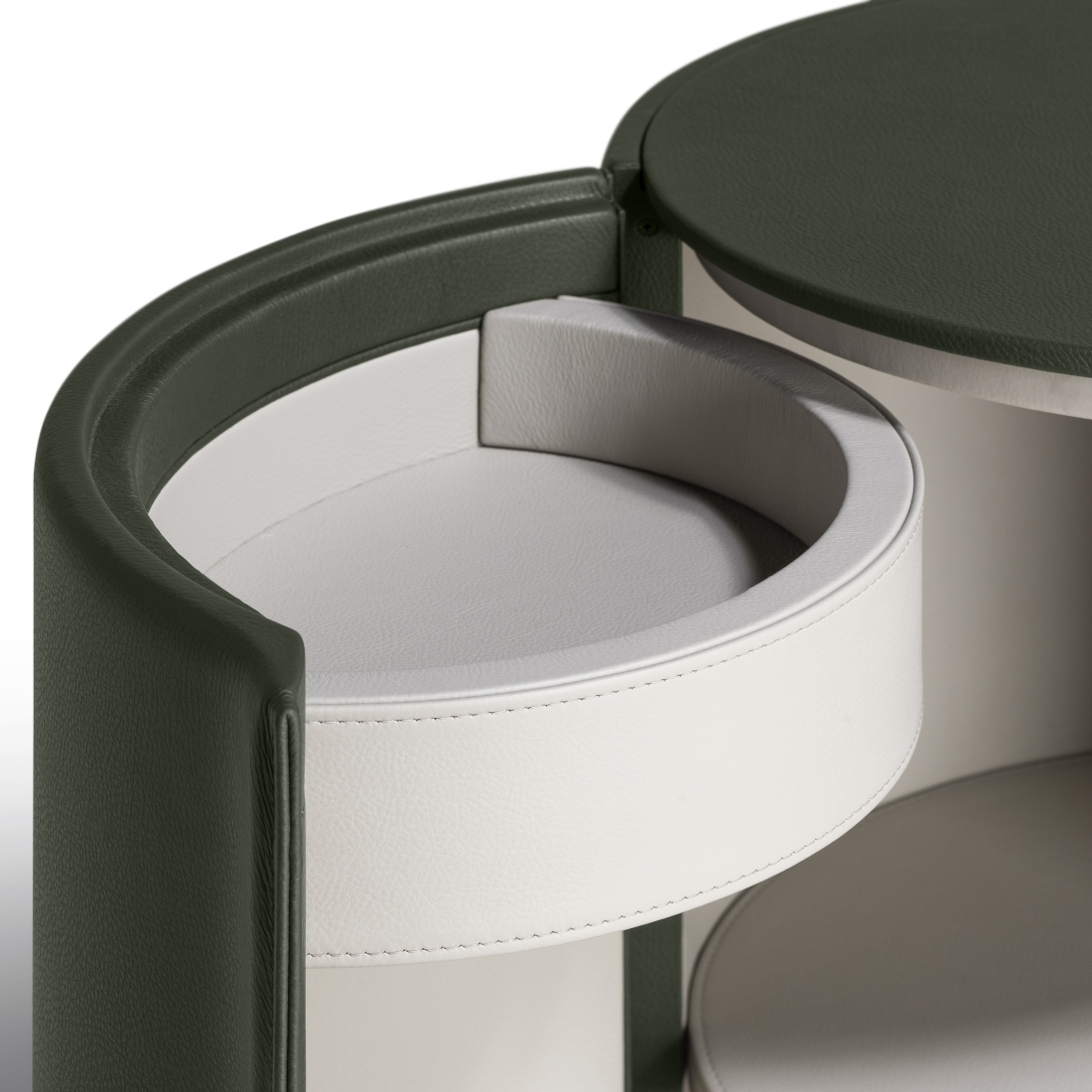 Upholstery available in Pelle Frau® leather: ColorSphere® (SC), Nest, or Soul. Features refined tone-on-tone stitching. The Poltrona Frau® logo is hot-stamped on the lower back, offering a discreet yet distinctive signature.