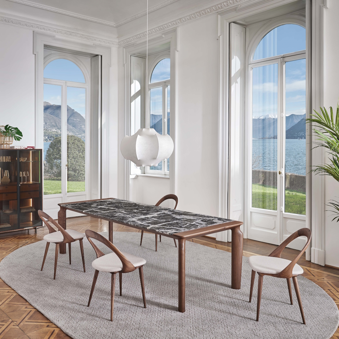 Composed with interlocking curves and contrasting materials, the Porada Amphora dining table introduces sculptural movement into the dining space. The base, formed from two intersecting elliptical legs in solid Canaletto walnut, creates tension and symmetry beneath a polished marble top. Its architectural silhouette lends quiet drama to gallery-style or penthouse interiors.