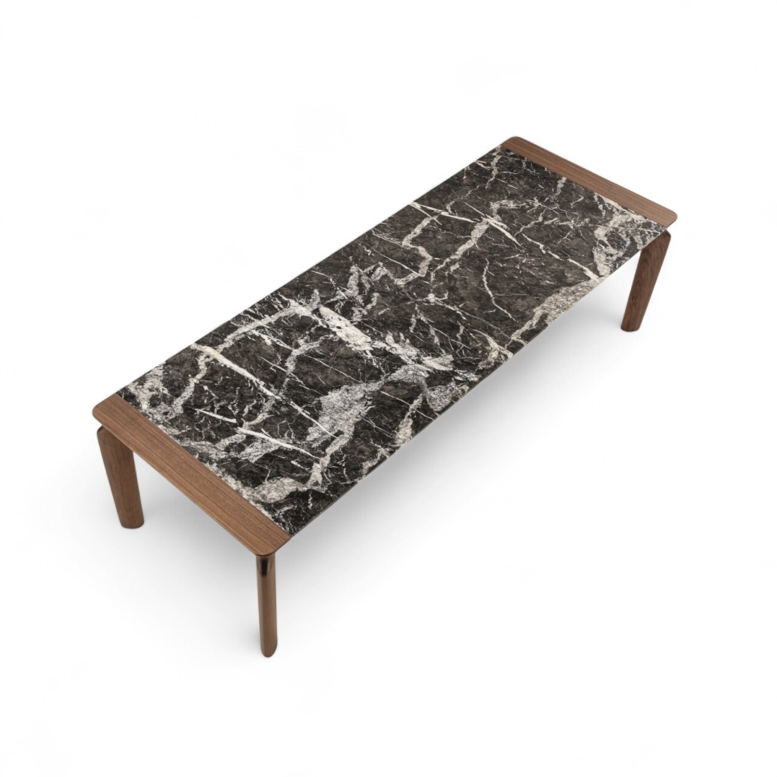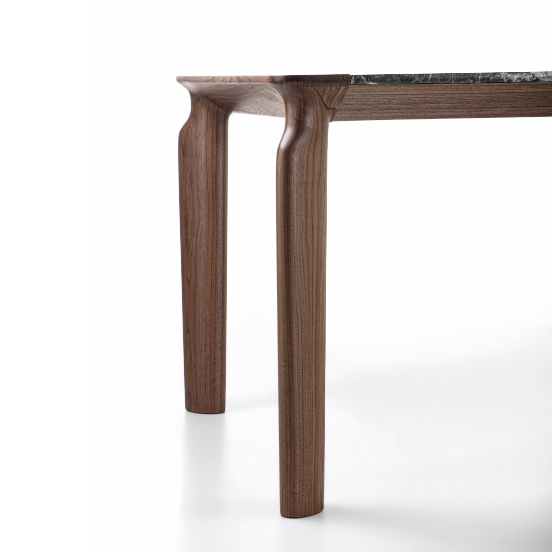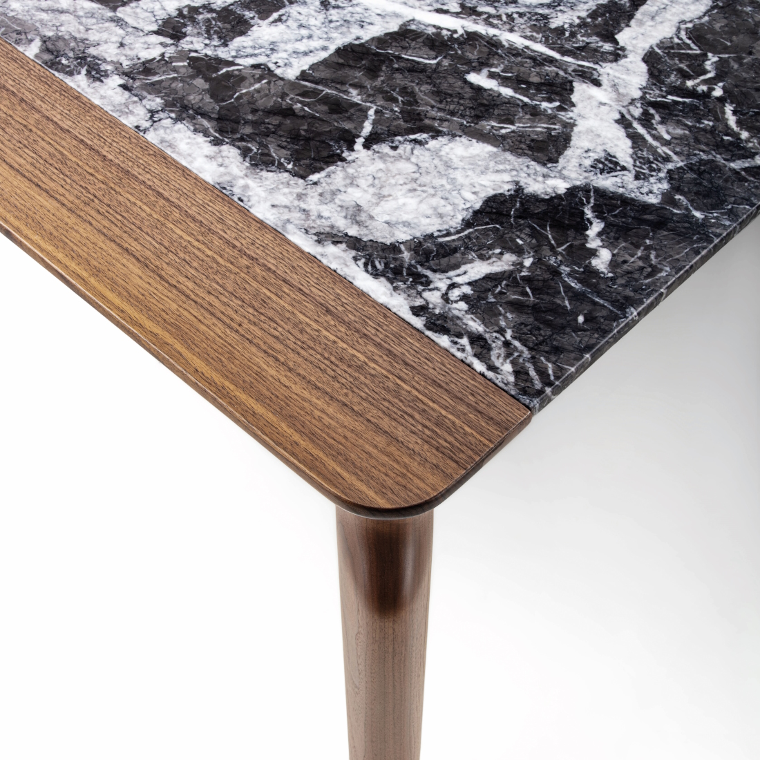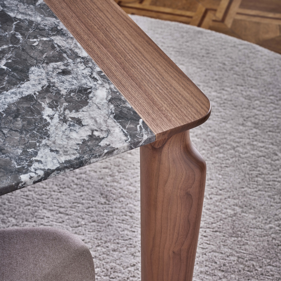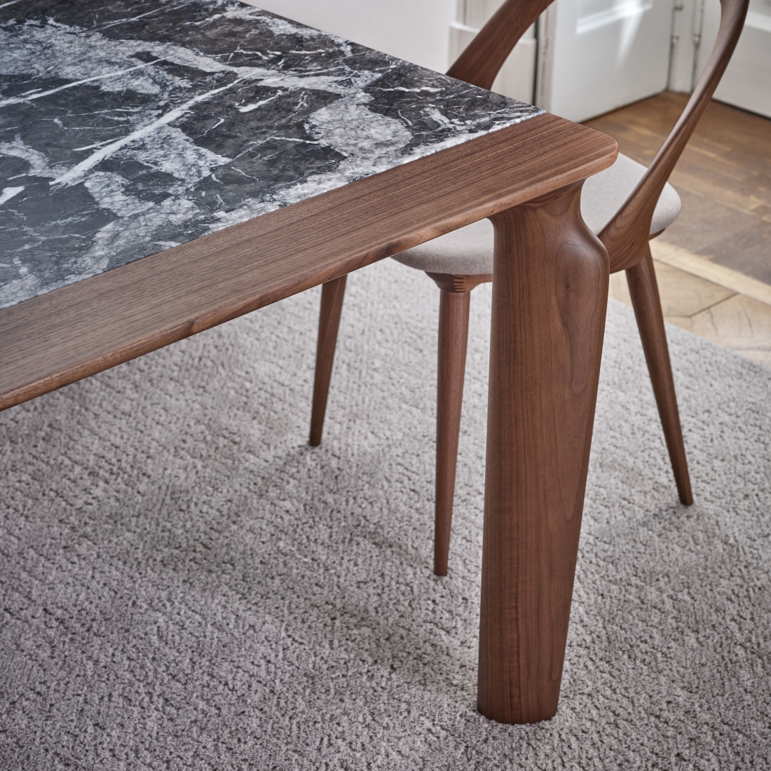 Dining table with marble top and perimeter legs in solid canaletta walnut.
