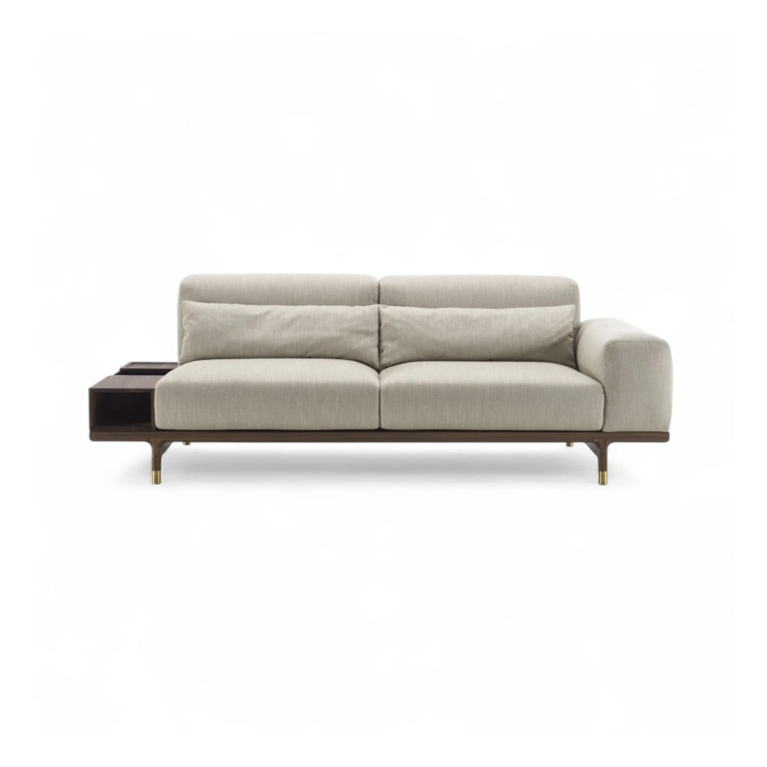 This two-seater sofa features a solid canaletta walnut frame with end-feet in either black chromed or brushed brass. The fabric cover is removable by detaching the seats with the supplied key, while the leather cover is fixed. The seats rest on a thick, flexible plywood panel covered in technical velvet, featuring holes for increased airflow. These seats are upholstered with high-resilient, crush-proof polyurethane foam of varying densities and topped with Memory Foam, all covered by padding paired with cotton and velveteen fabric. The arm and back structures are made from poplar and birch plywood, upholstered with crush-proof foam and similarly covered. Optional backrest cushions are filled with canalised goose feather, certified by Assopiuma’s Golden label, and encased in feather-proof cotton fabric.