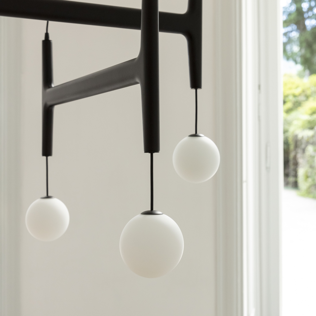 This chandelier boasts a solid canaletta walnut frame with white opal frosted glass diffusers, all suspended by a matt black silicone rubber cable. The fixture is completed with a matt black metal ceiling rose and spacer ring.
