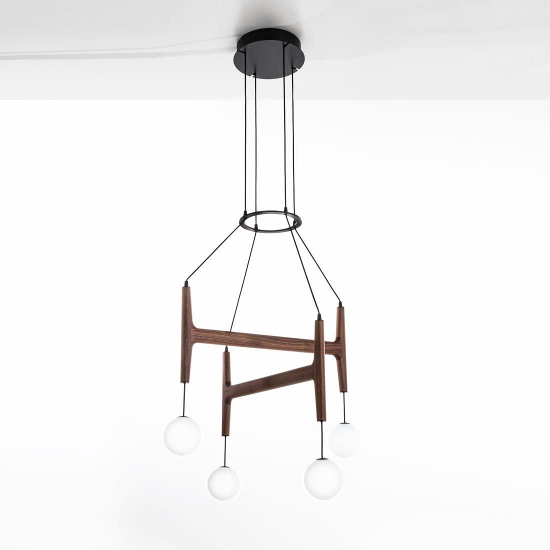 The frame is CNC-shaped from Canaletto walnut and hand-finished in stained or lacquered tones. Two opal glass globes diffuse light through acid-etched surfaces, casting a soft, ambient glow. A matte black ceiling rose, spacer ring, and height-adjustable silicone cables provide compositional contrast—defining this piece as architectural chandelier lighting for refined residential or commercial spaces.