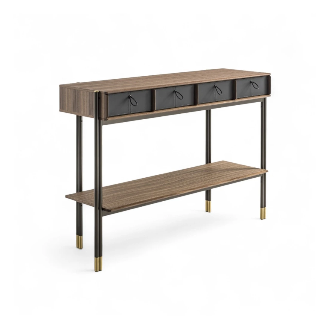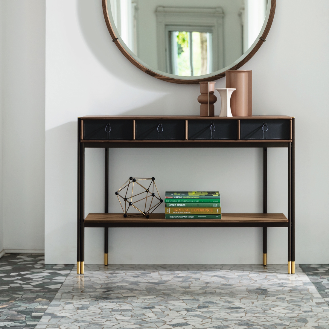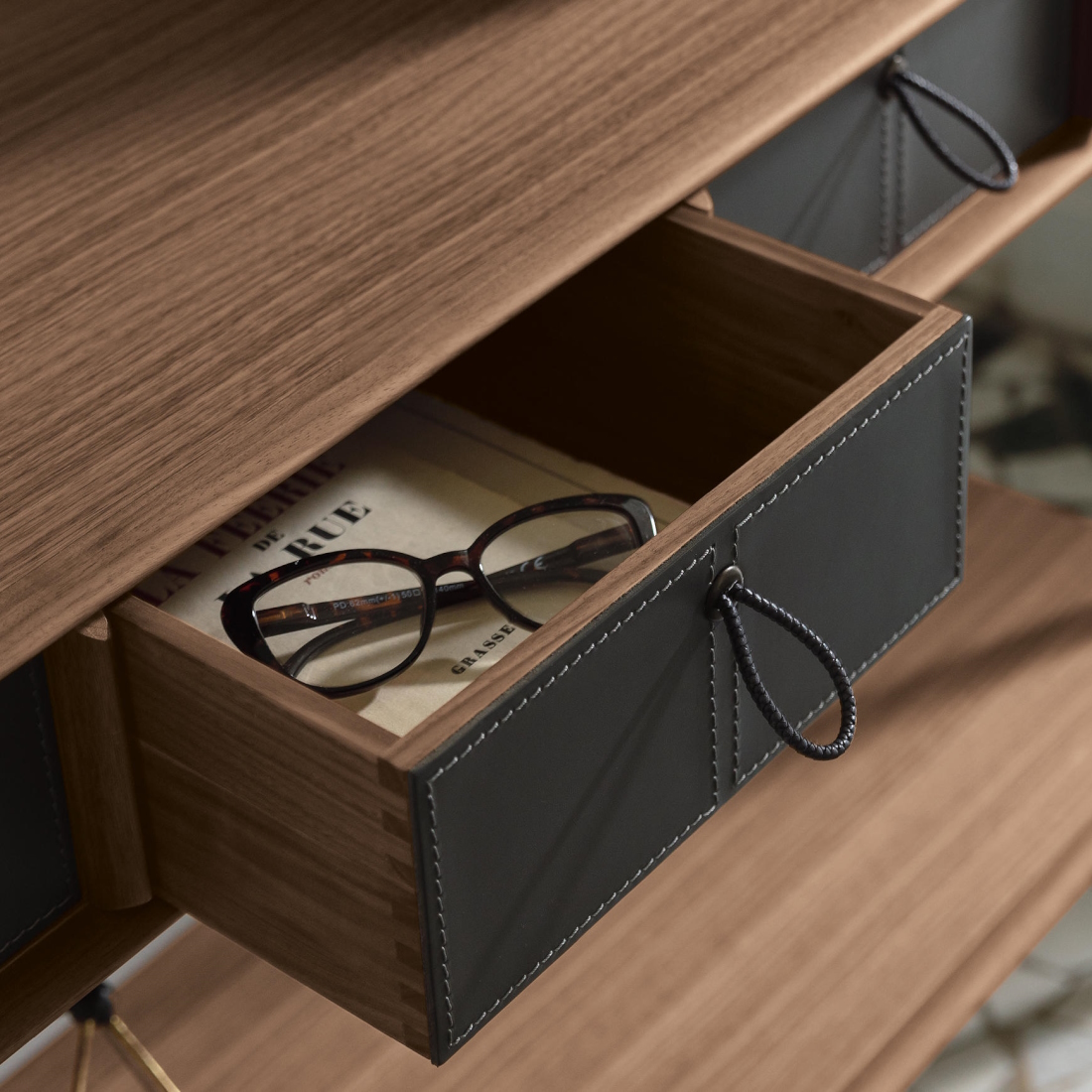 Crafted from Canaletto walnut using traditional joinery, the piece features four drawers with customisable fronts in wood or saddle-stitched leather. Solid walnut dividers and edging reinforce the frame’s material clarity, while a wengé-stained finish offers tonal depth. A composed expression of designer console furniture engineered for both spatial rhythm and discreet storage.