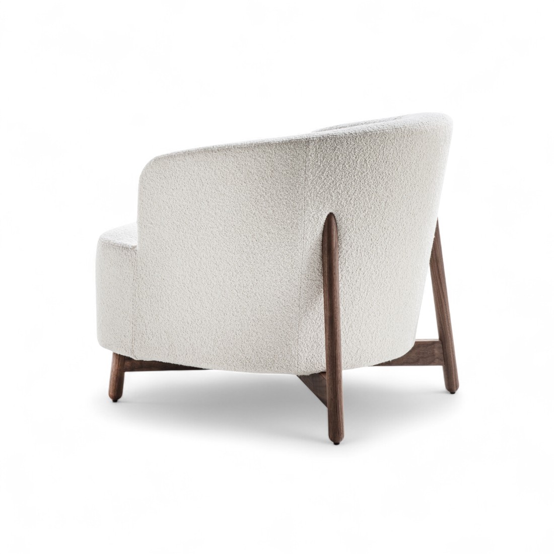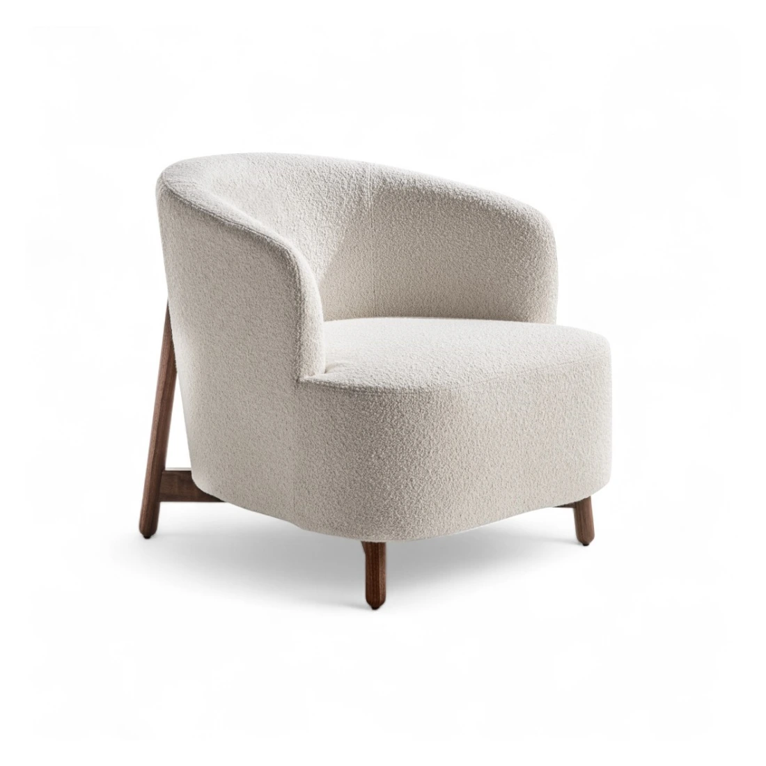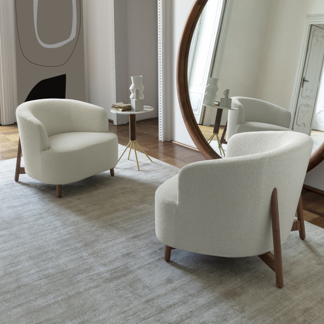 With its low-profile back and enveloping silhouette, the Copine armchair by Porada introduces sculptural warmth to reading corners and design-led living spaces. The curved seat and gently sloped arms create a sense of architectural intimacy, supported by a grounded walnut frame.