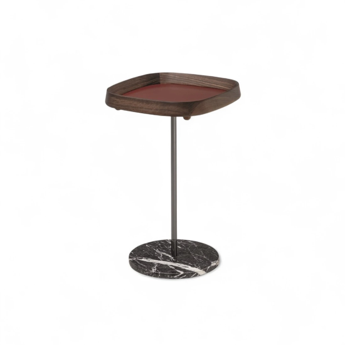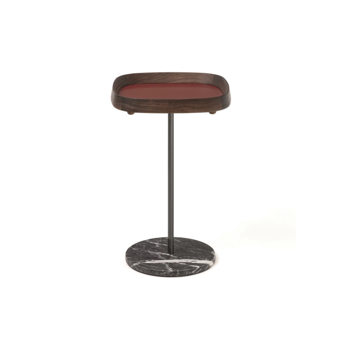 Side table with a metal frame, marble base, and a removable tray (Mix Tray) in solid Canaletto walnut, covered with Cuoietto leather. The grey Carnico marble base version features a shiny grey pewter metal structure, while the white Calacatta Gold marble base version has a champagne metal structure.