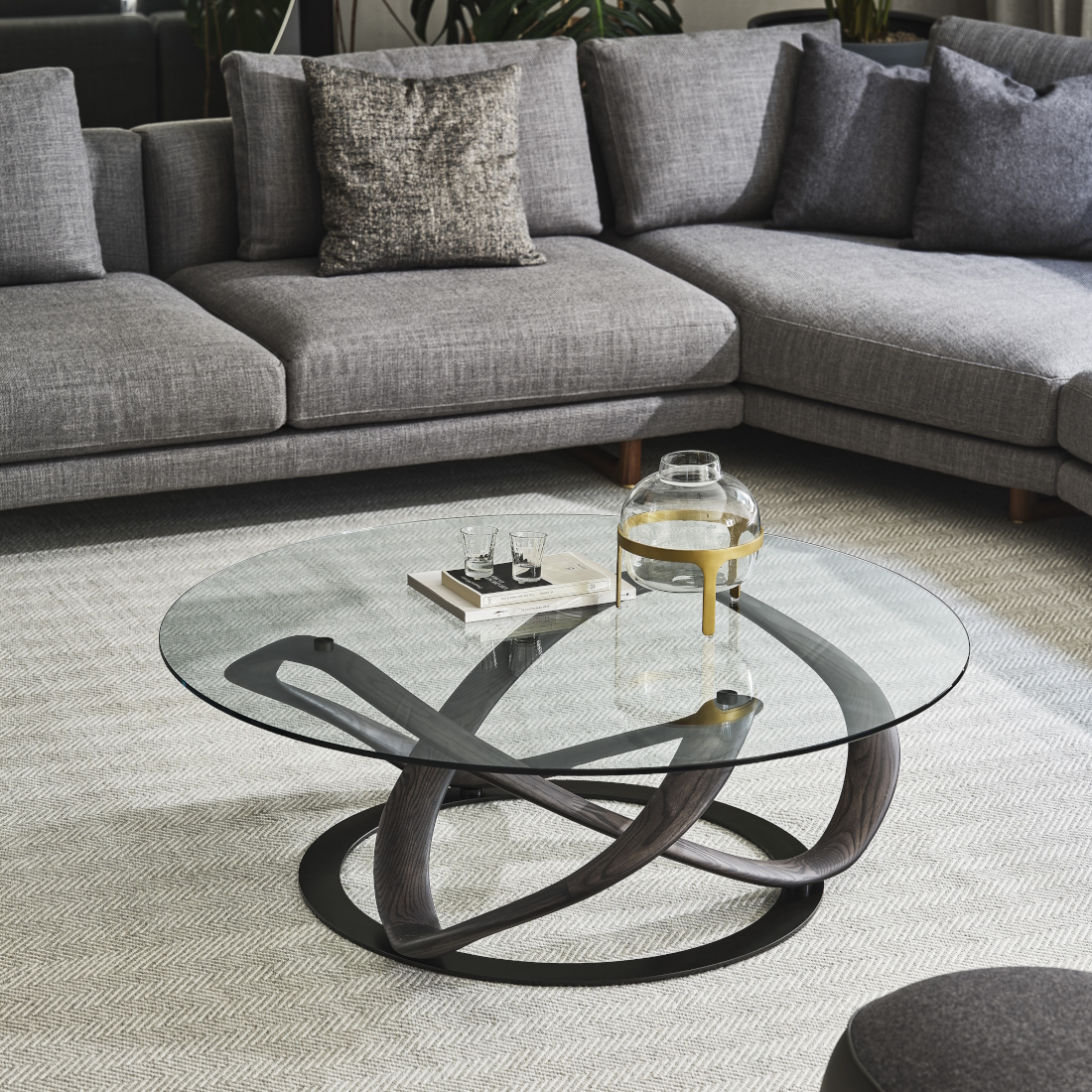 This coffee table has a 10mm thick tempered glass top, available in either transparent or smoked finishes, anchored to a solid wood base secured on a metal ring.