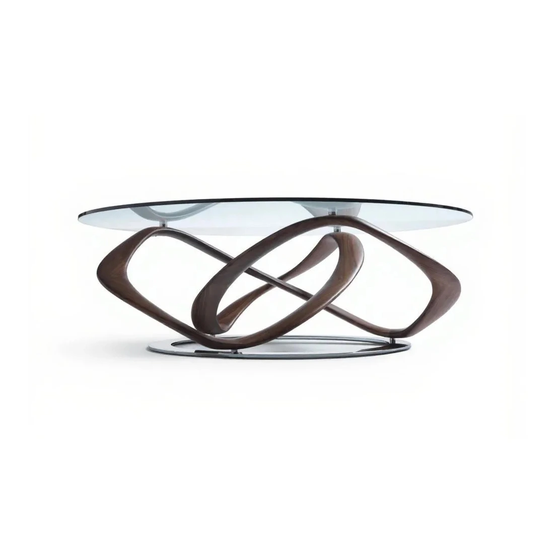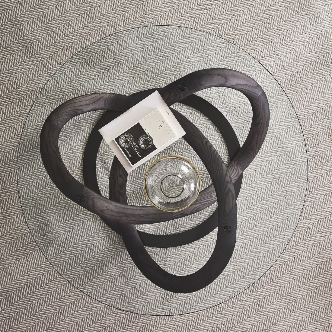 Crafted in solid ash or Canaletto walnut, or finished in matt lacquer, the interwoven frame is shaped using advanced CNC milling and artisanal hand-finishing. A 10mm tempered glass top rests above the base, offering unobstructed views of the composition below—transforming this piece into a study in symmetry, rhythm, and craft.
