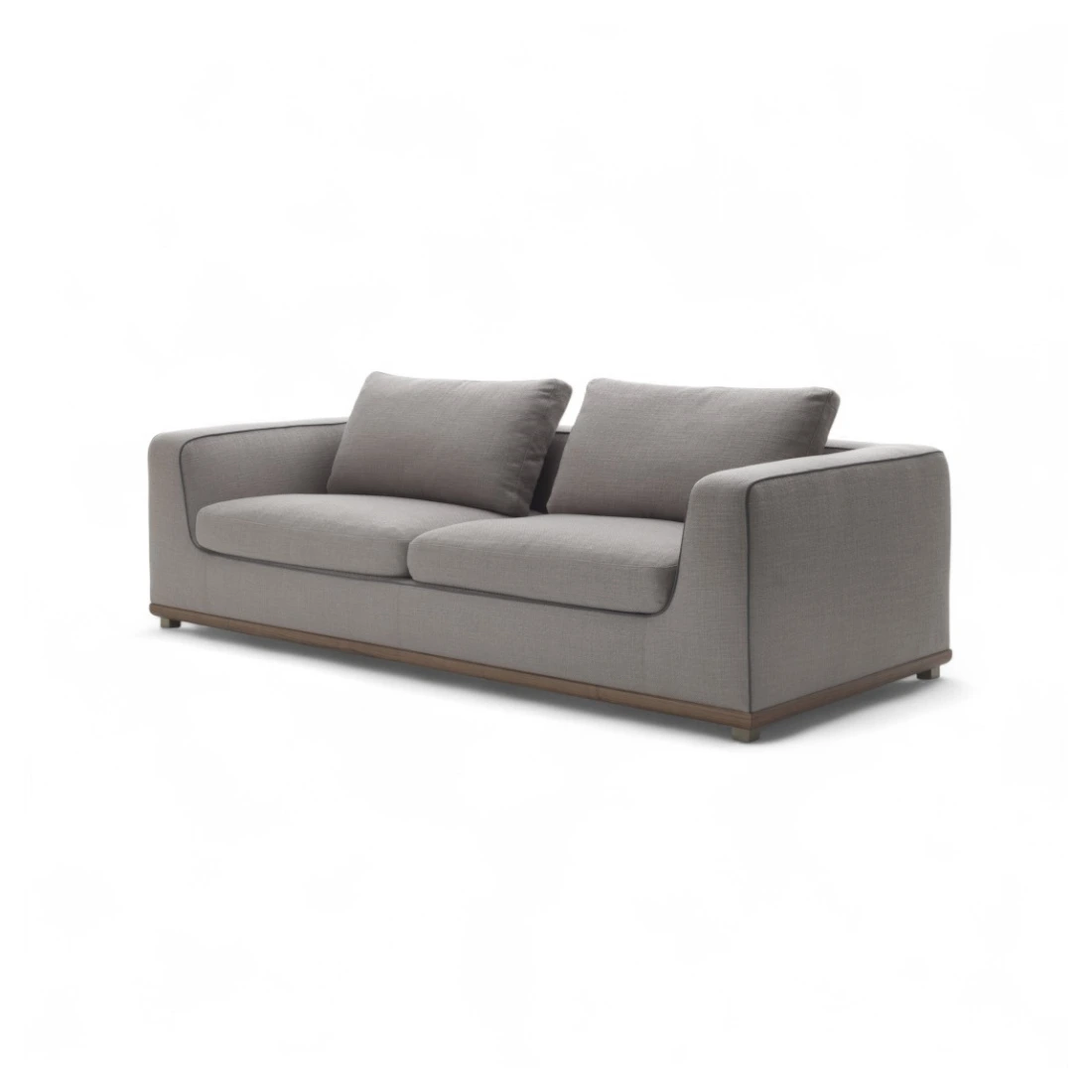 This sofa features a solid canaletta walnut base supported by bronzoro metal feet. The frame, made of solid wood and plywood, is rubber-coated with high-density crushproof polyurethane. It comes with gold label feather-filled seat and back cushions, which have a high-density crushproof polyurethane insert and are covered by feather-proof cotton fabric. While the fabric frame covers can be removed by disassembling the supporting base and unlocking the bottom screws, the cushion covers are always removable. When ordering, it’s compulsory to specify the colour of the piping from the available options in the ZENITH collection or to inquire about matching it with the sofa’s fabric.