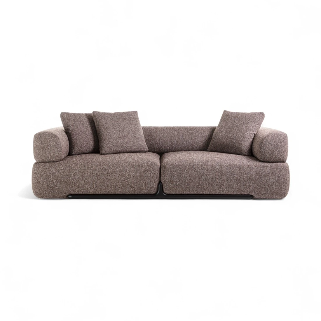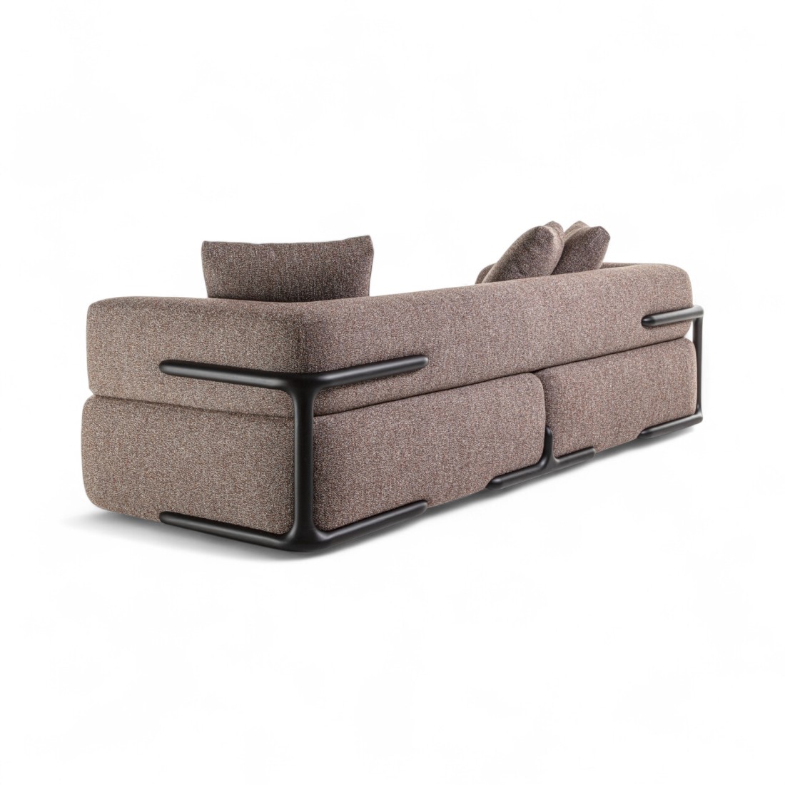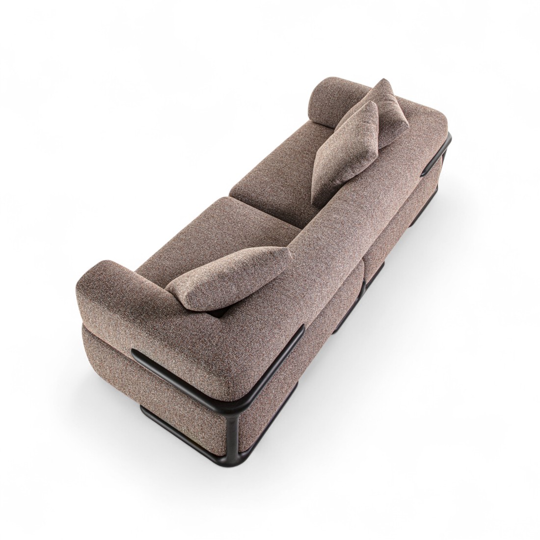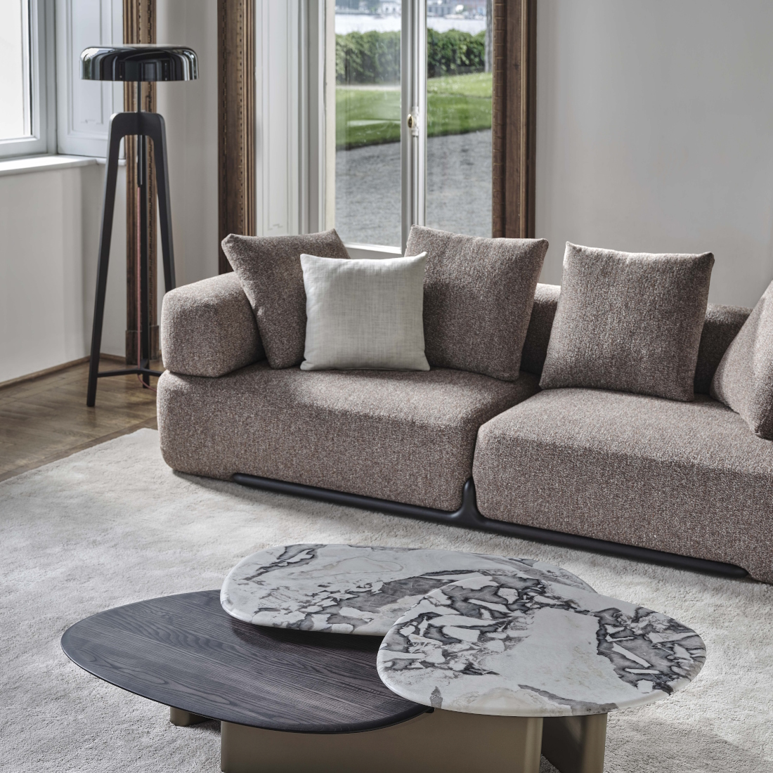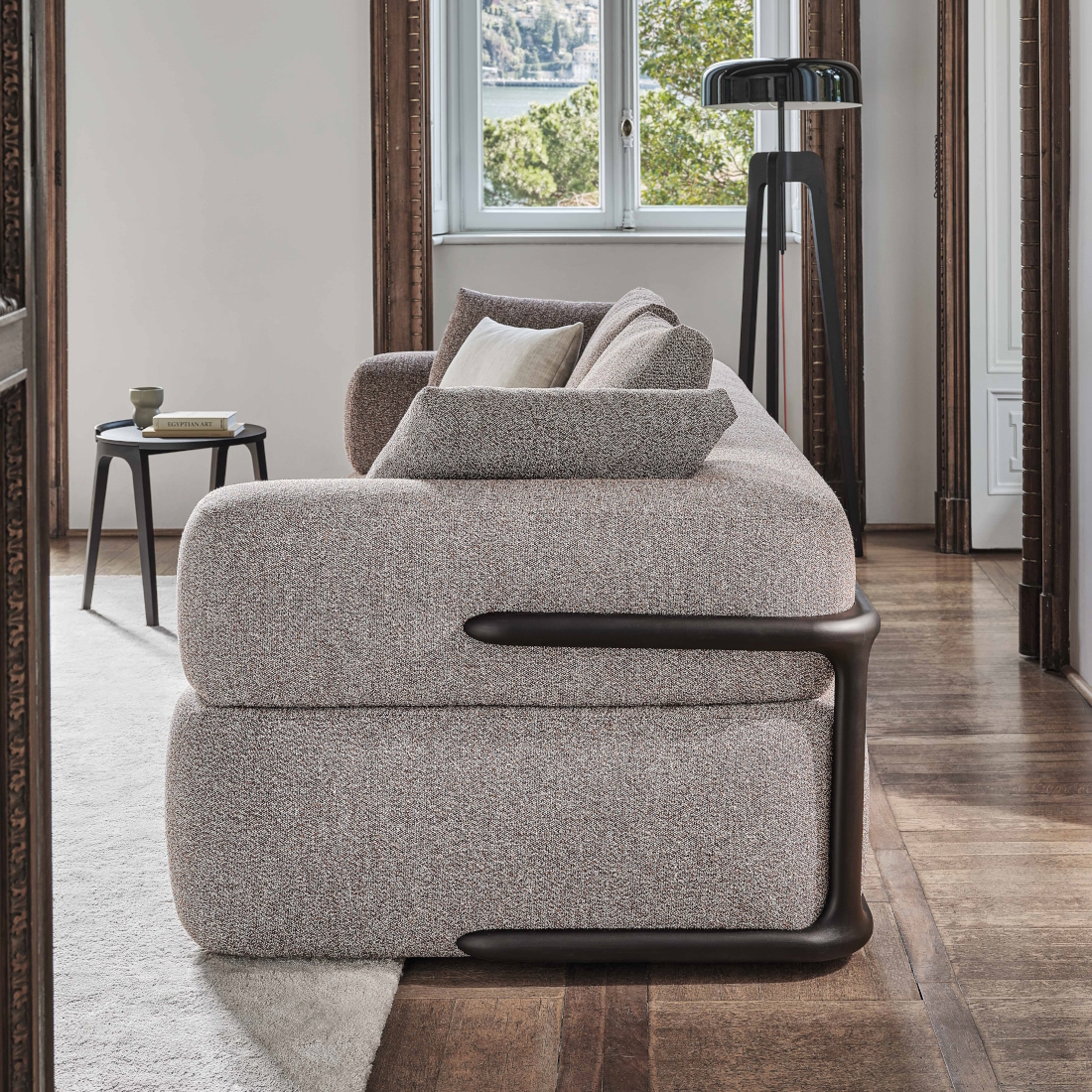 This sofa comes with upholstery in either fabric or leather, with removability possible for fabric. The solid canaletta walnut frame is offered in various finishes and houses an internal structure made of plywood, solid fir, or poplar with elastic straps. The padding is crafted from polyurethane foam of different densities, wrapped in a polyester fibre cover. Nylon end-feet.