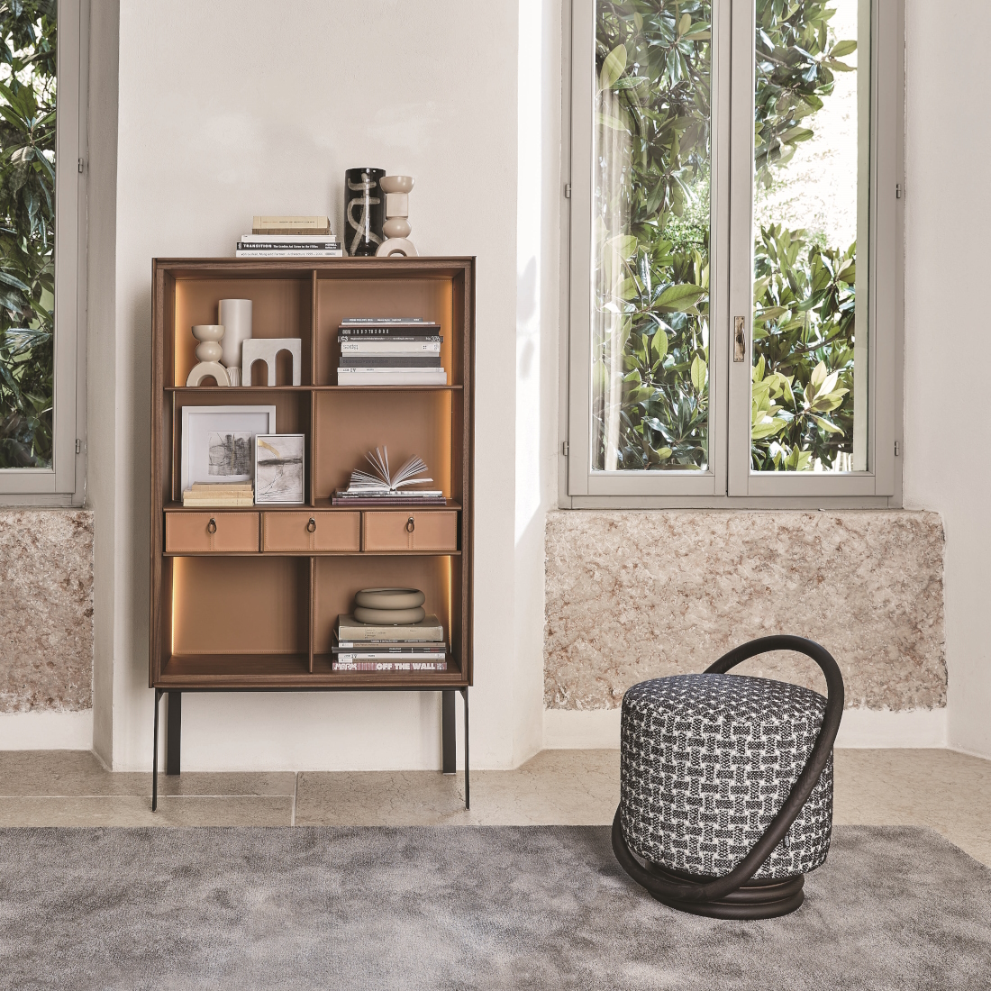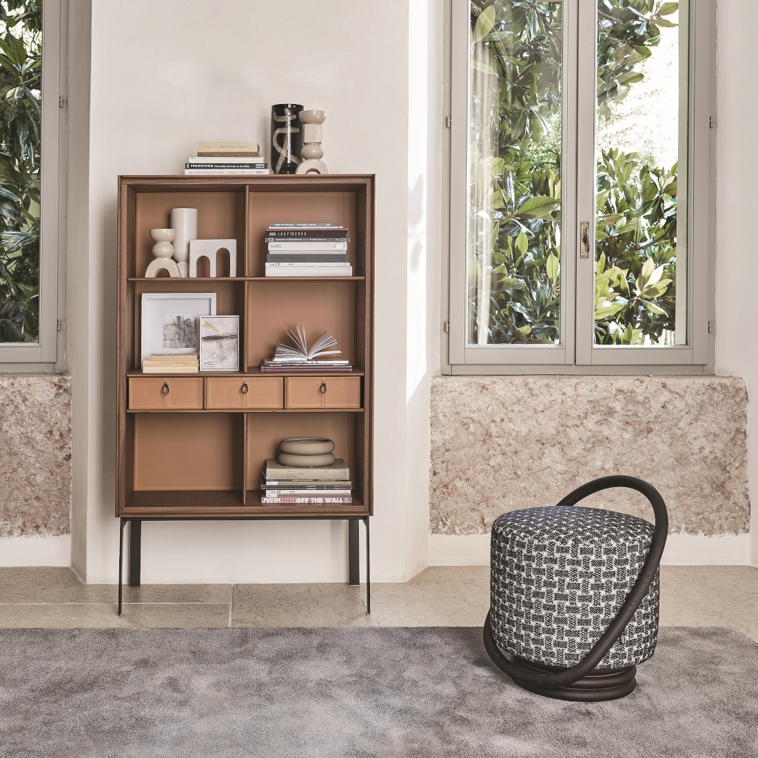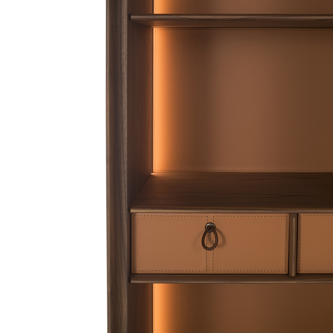 This open cupboard, crafted in canaletta walnut, stands on a grey pewter metal base. The back panel is available in options of wood, textured bronze metal, or Cuoio, offered in various colours from the collection. For added functionality, it can accommodate up to three drawers, which come with the option of either wooden or Cuoio fronts.