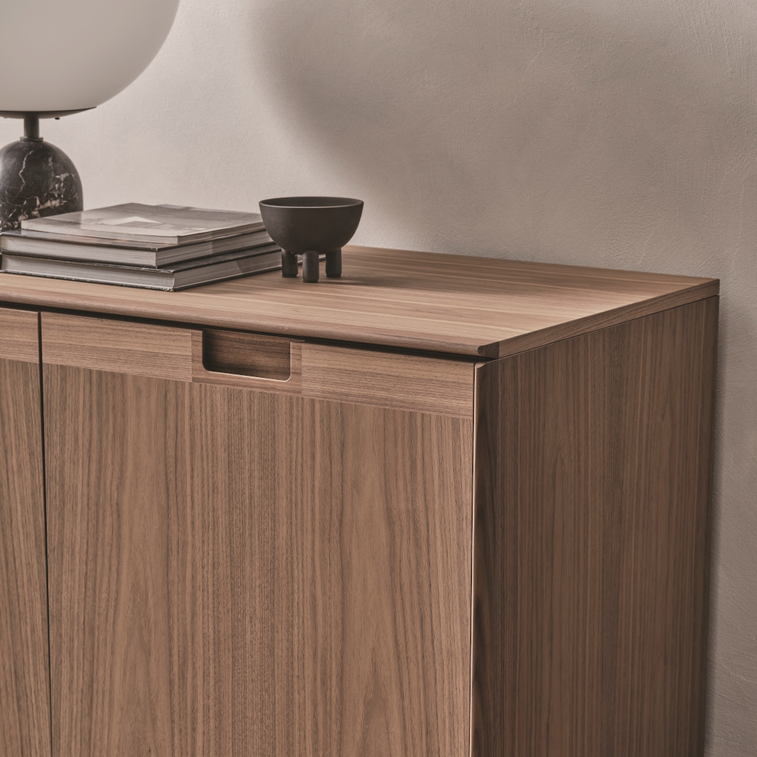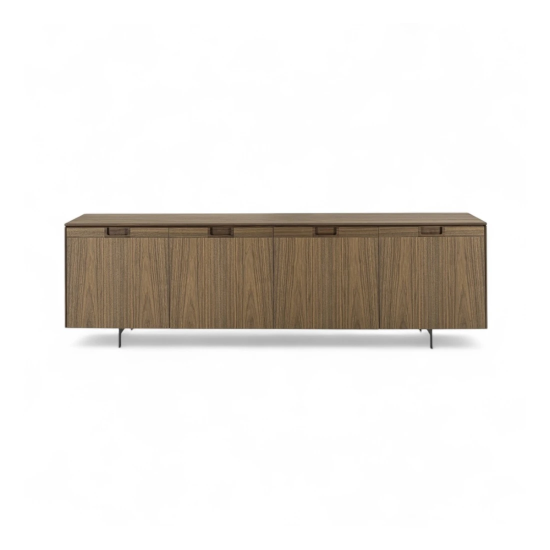 Defined by its rhythmic façade and monolithic stance, the Matics 4 sideboard by Porada anchors gallery-style interiors with sculptural precision. Four hinged doors in solid Canaletto walnut alternate horizontal and vertical grain direction—creating a tactile pattern that plays with light, shadow, and movement across the surface.