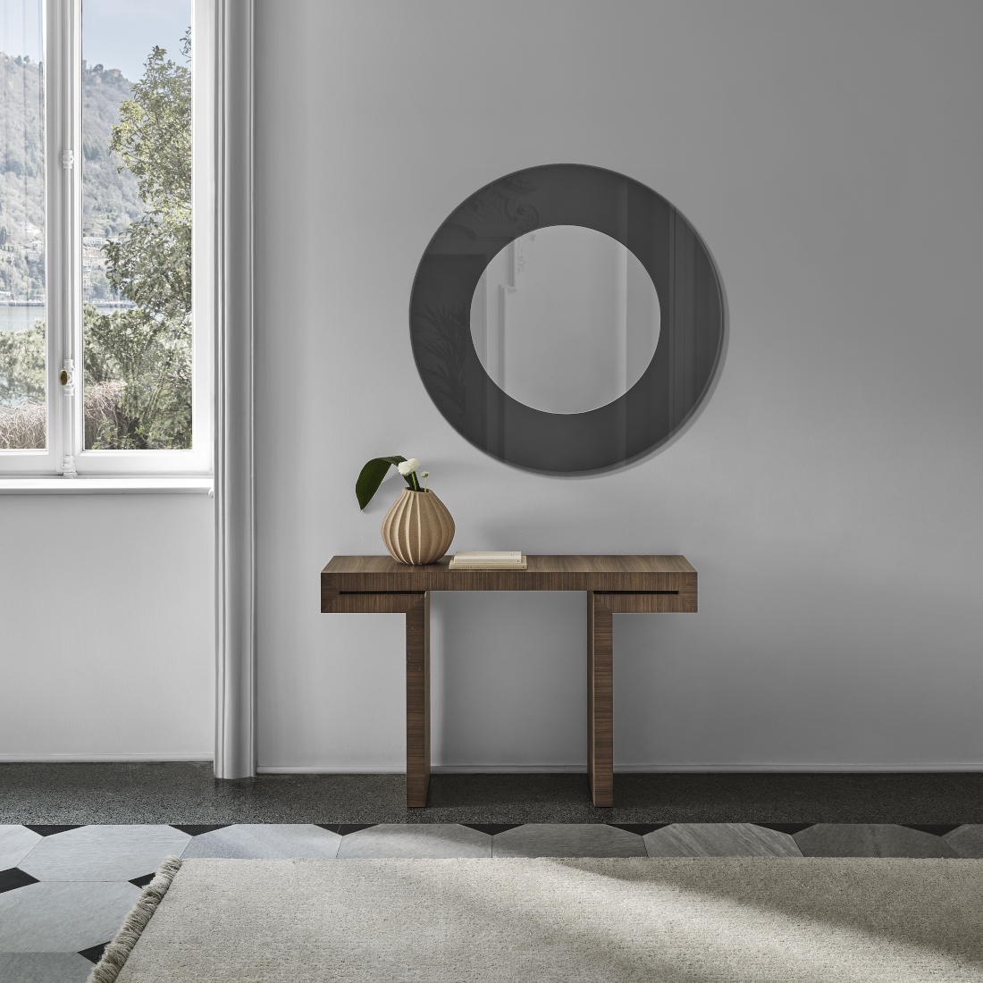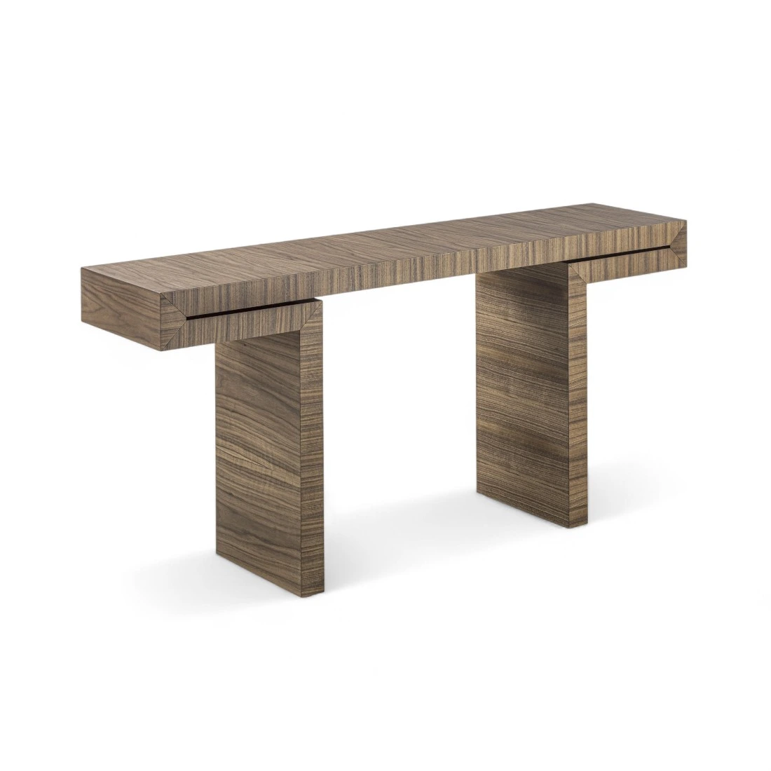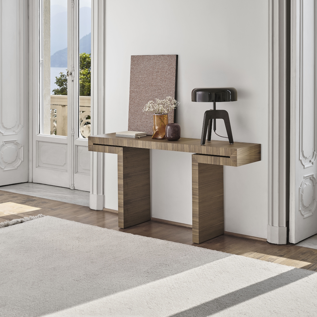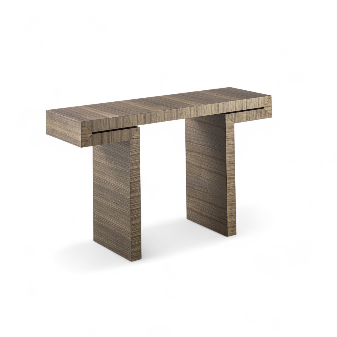 Crafted in matched veneer—offered in Canaletto walnut, Spessart oak, or Macassar ebony—the surface is bookended by a continuous grain flow that underscores the table’s architectural form. Edges are mitered with millimetric precision, and the base is weighted for stability. A luxury wood console table designed for gallery-style interiors, refined hallways, or architectural living spaces where craft becomes focal point.