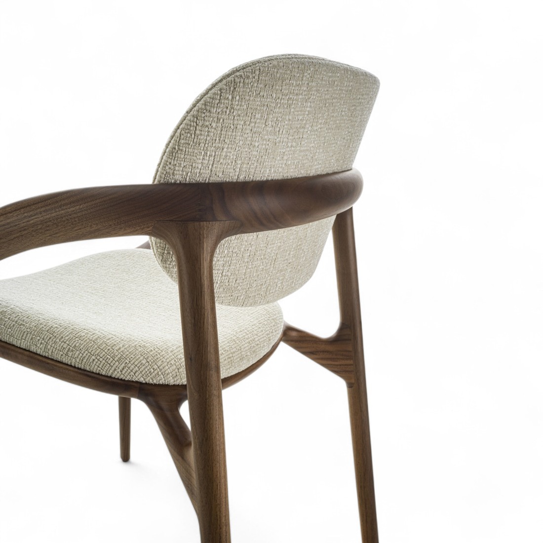 This armchair features a solid canaletta walnut frame available in various finishes and is upholstered in your choice of leathers or fabrics from the Porada collection.