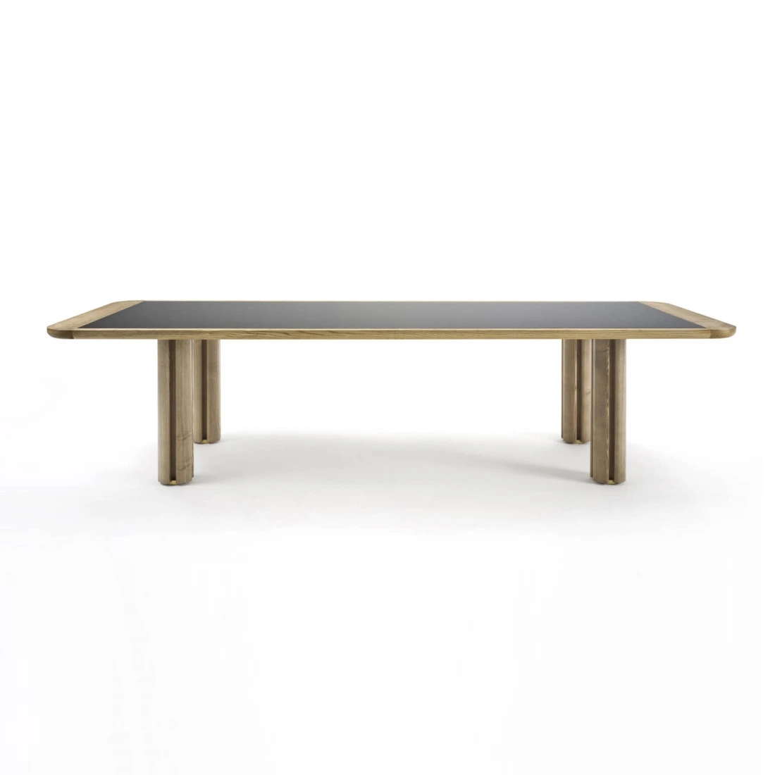 Defined by its clean architectural volume, the Porada Quadrifoglio dining table integrates a recessed base and chamfered edge to emphasise compositional balance. The rectangular top is finished in a high-performance ceramic rock surface—offered in three tonal variations—bringing refined tactility and engineered durability to design-led dining rooms and contemporary interiors.