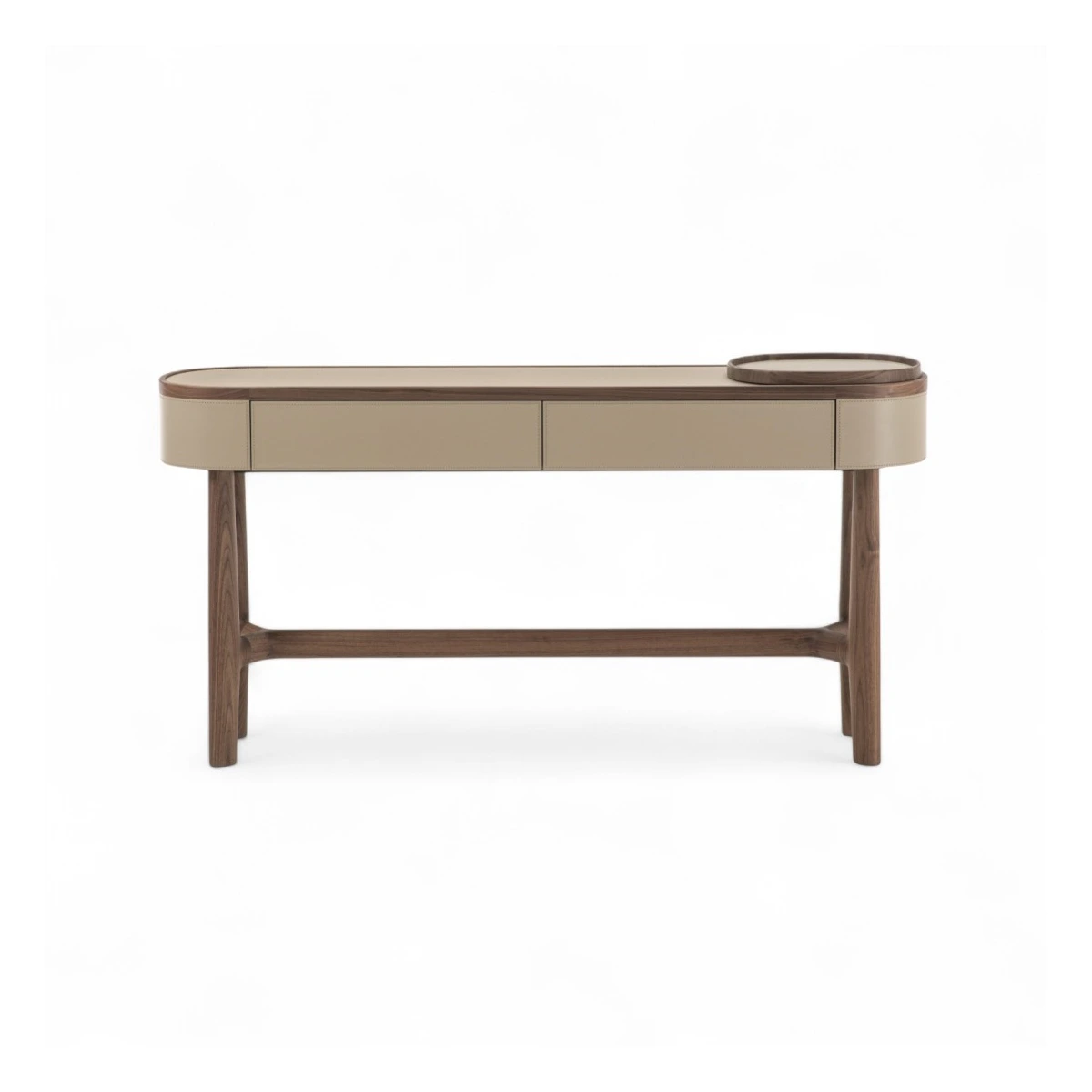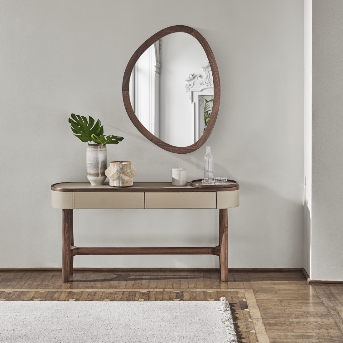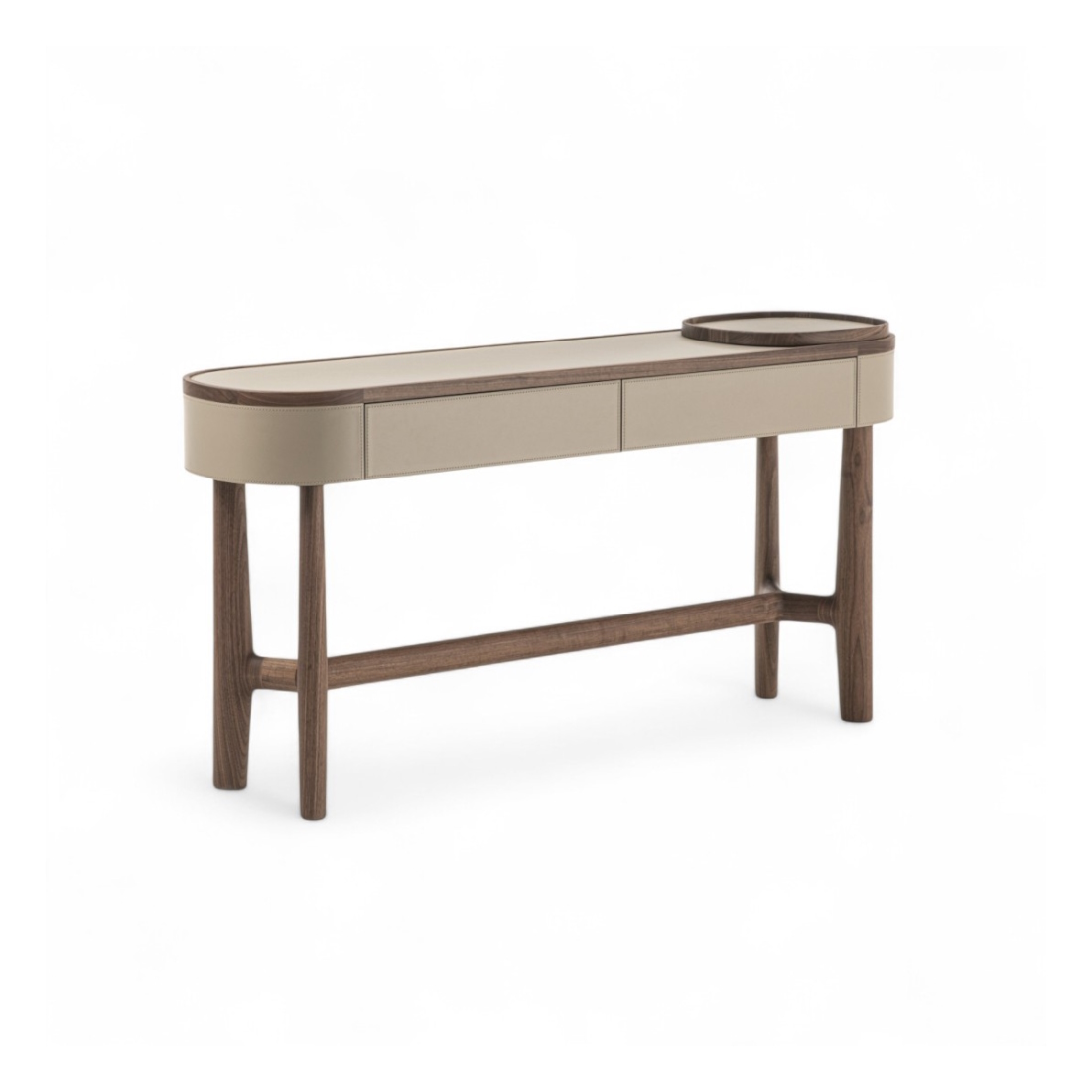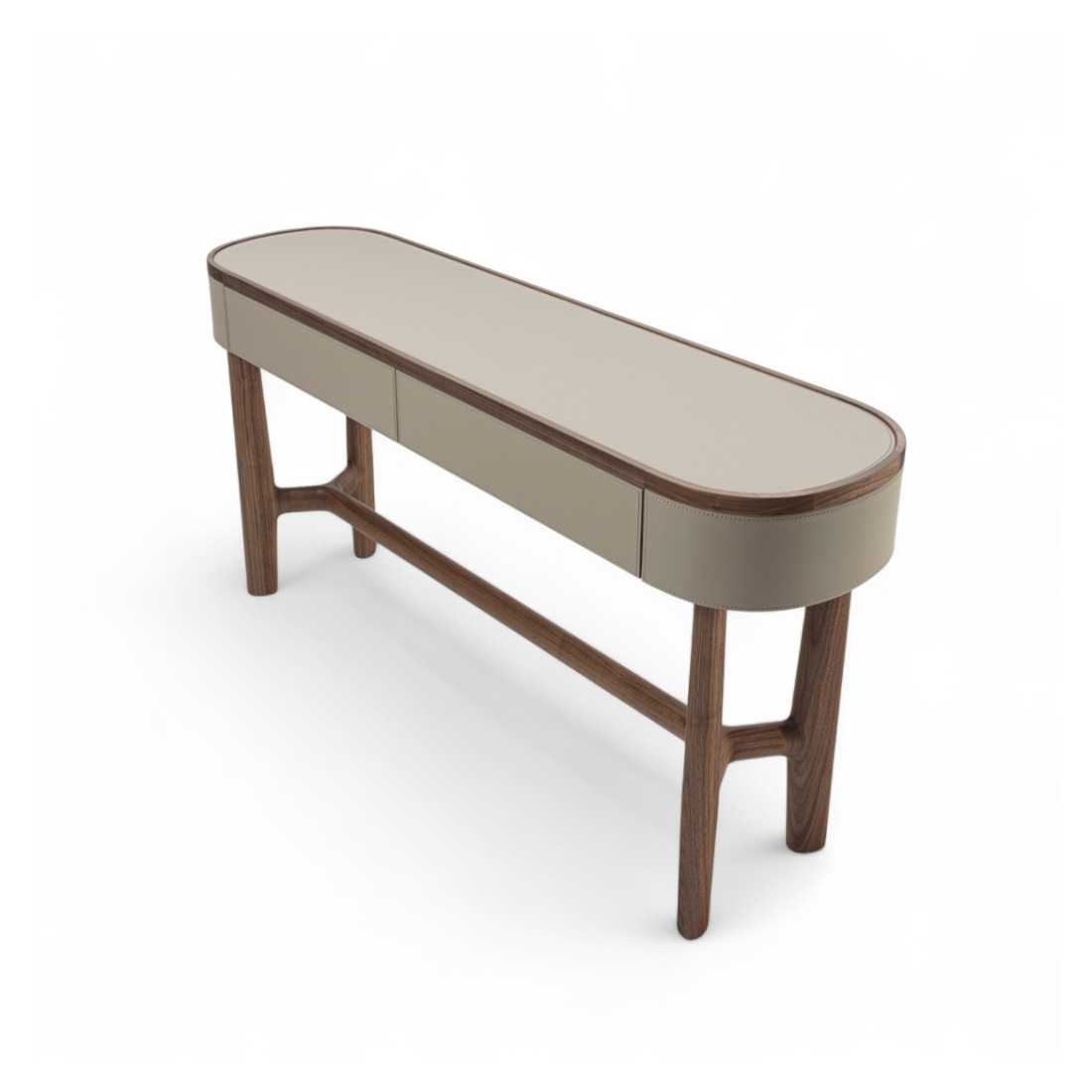 Crafted in Italy from solid Canaletto walnut, the console is joined using traditional woodworking techniques and detailed with Cuoietto-lined drawer bottoms for a refined tactile experience. The top is available in walnut, leather-wrapped timber, or Rock ceramic, each bordered with solid wood edging. A luxury console table that balances function, material contrast, and formal composure.