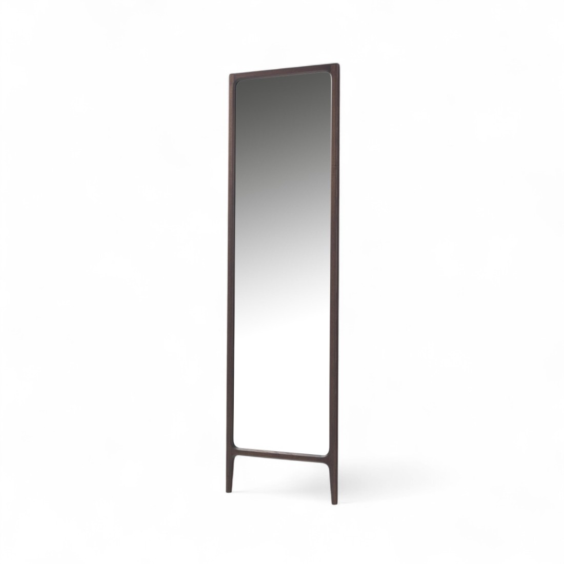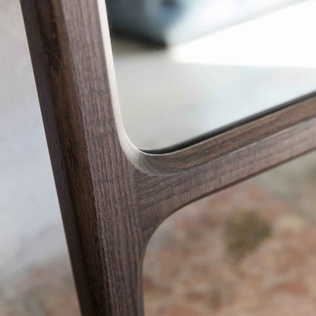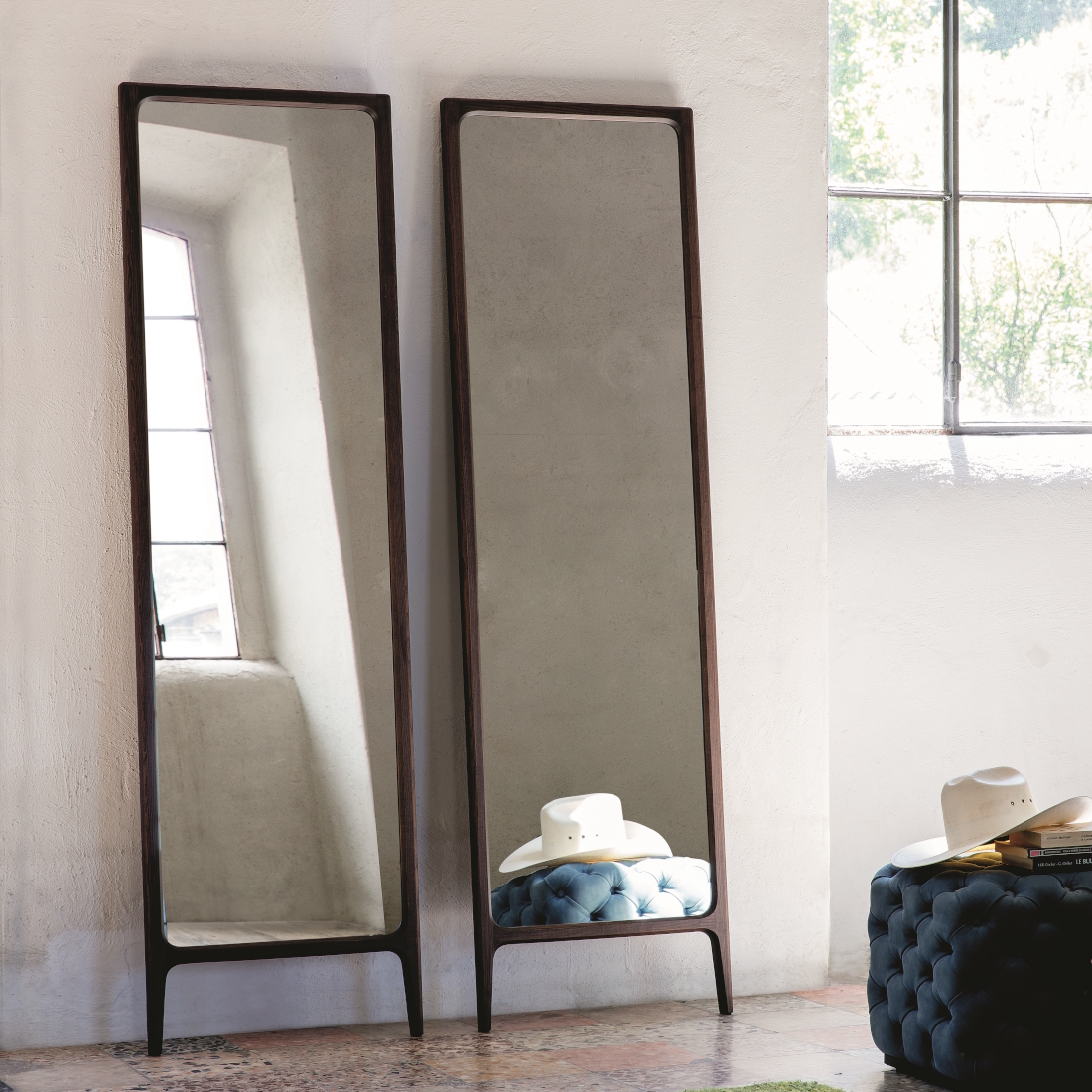 Crafted in Italy from solid ashwood, the structure is shaped with softened edges and finished by hand in a selection of stained or lacquered options that enhance the natural grain. The clear mirrored surface is precision-fitted within the frame, while subtle joinery details reinforce both strength and material elegance—a designer wooden mirror that balances composure, craft, and spatial nuance.
