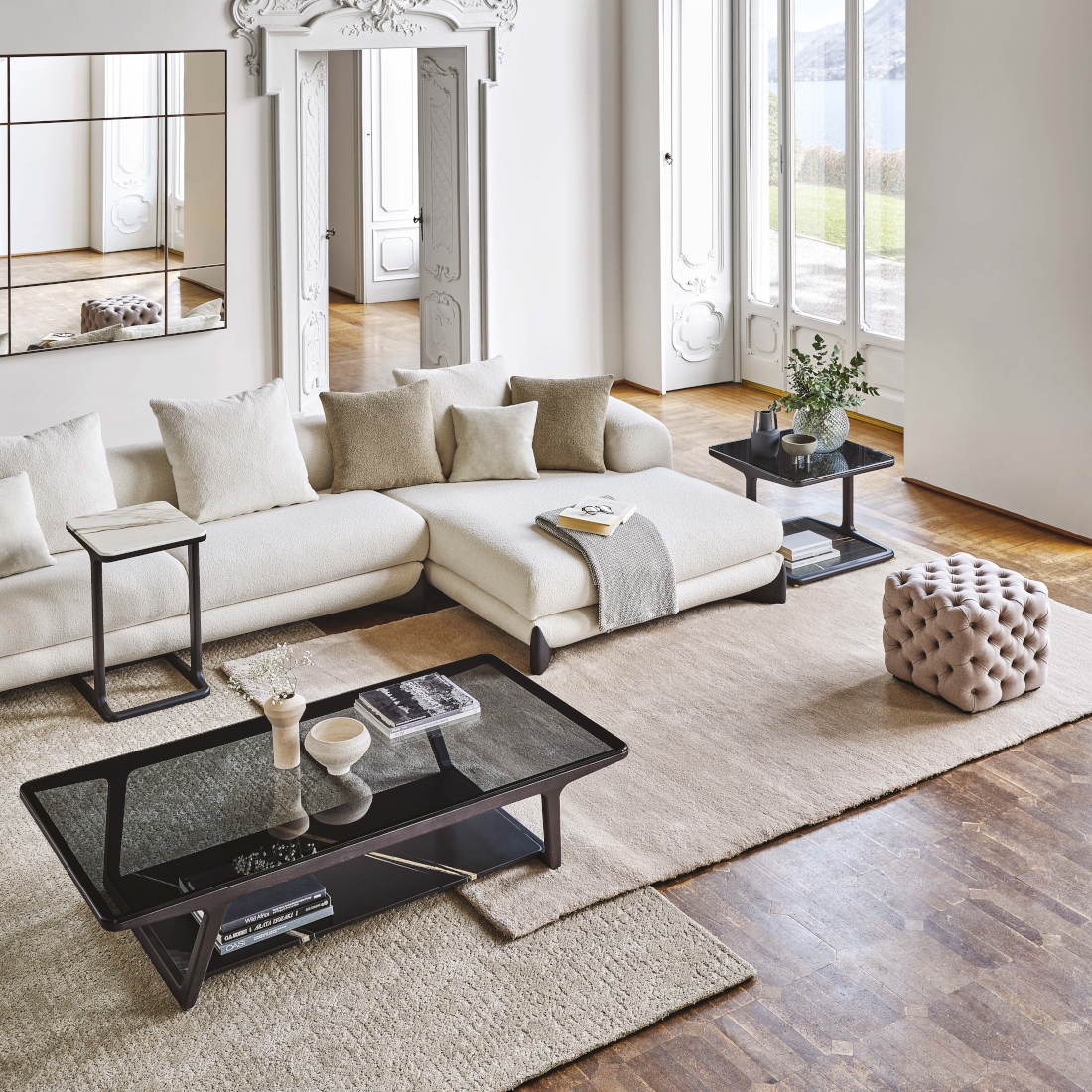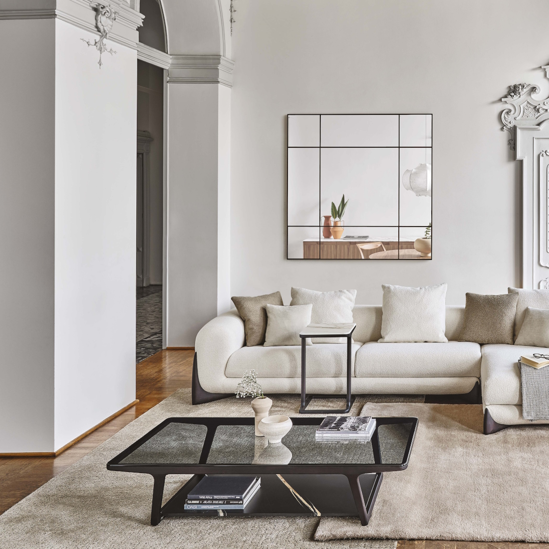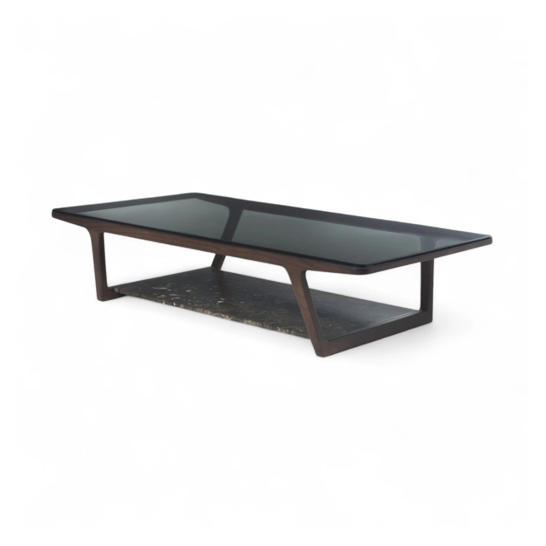 Crafted in Italy with a solid timber frame offered in stained or lacquered finishes, the structure supports a 10mm tempered glass top and a lower shelf in Calacatta, Sahara Noir, or Emperador marble. This designer coffee table unites formal clarity with material depth—an interplay of weight, lightness, and architectural rhythm.