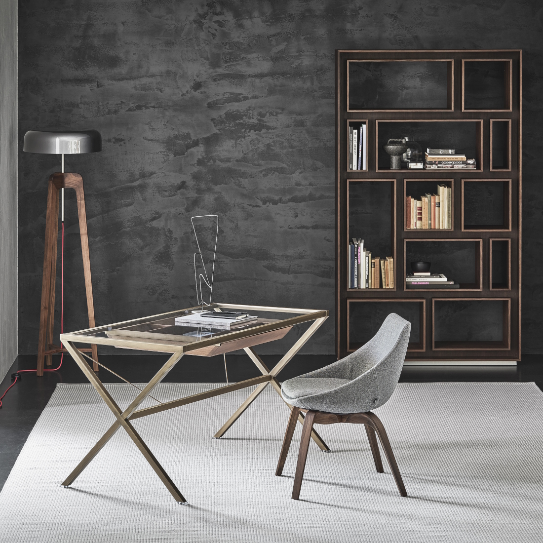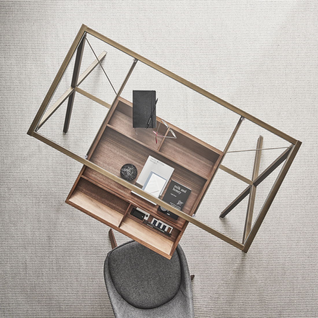 Composed with graphic tension and sculptural lightness, the Porada Stylo writing desk introduces architectural clarity to refined home offices and contemporary glass-wrapped workspaces. Its X-frame base in brushed bronzed brass supports a floating 8mm tempered glass top—offering both transparency and visual weightlessness.