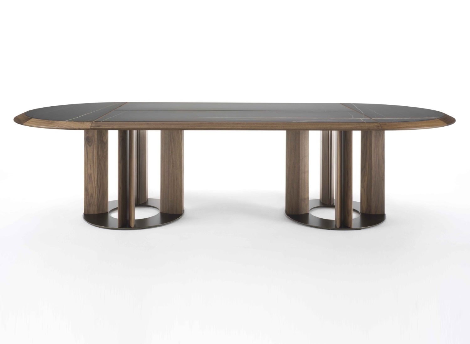 This dining table is crafted from solid canaletta walnut and features a top divided into four sections, available in either marble or wood. The table is supported by a metal base in a bronze finish.