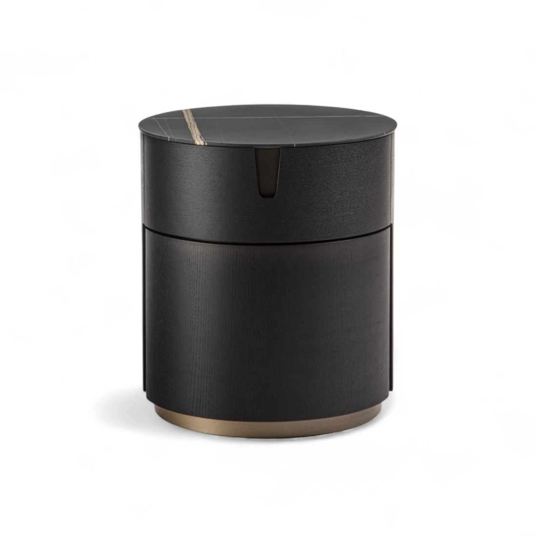 This bedside cabinet is crafted from canaletta walnut or ashwood in a wenge stain, featuring a metal base and recessed handles in a bronze finish. The top is available in wood or marble, and the drawer interiors boast a scratch-resistant titanium finish.