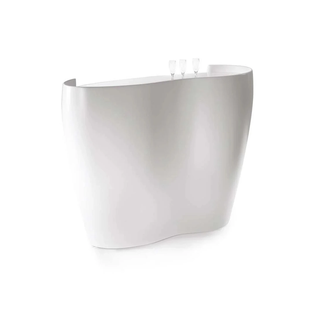 Shaped bar with top in lacquered glass same colour as structure and clear glass shelf.