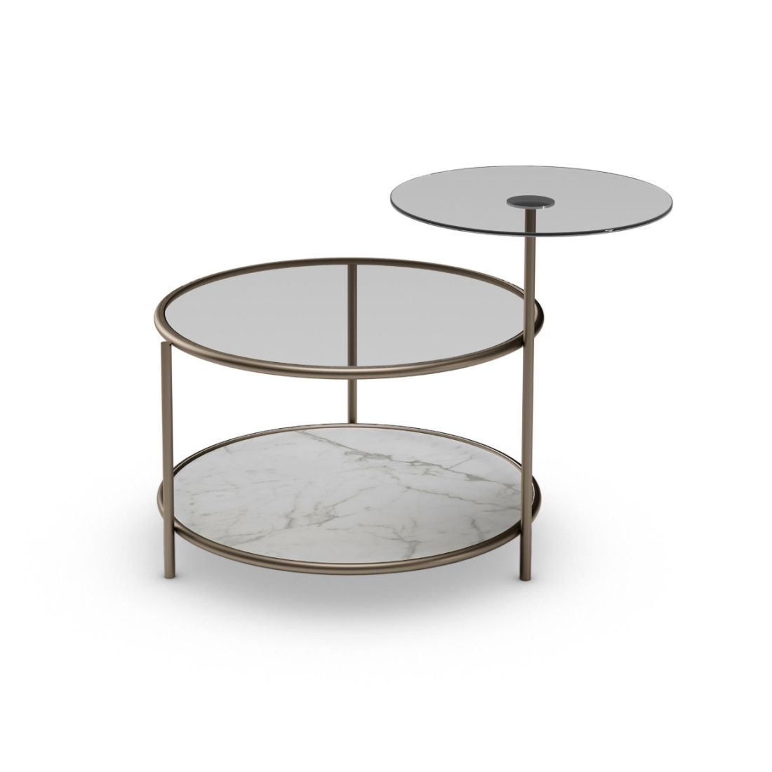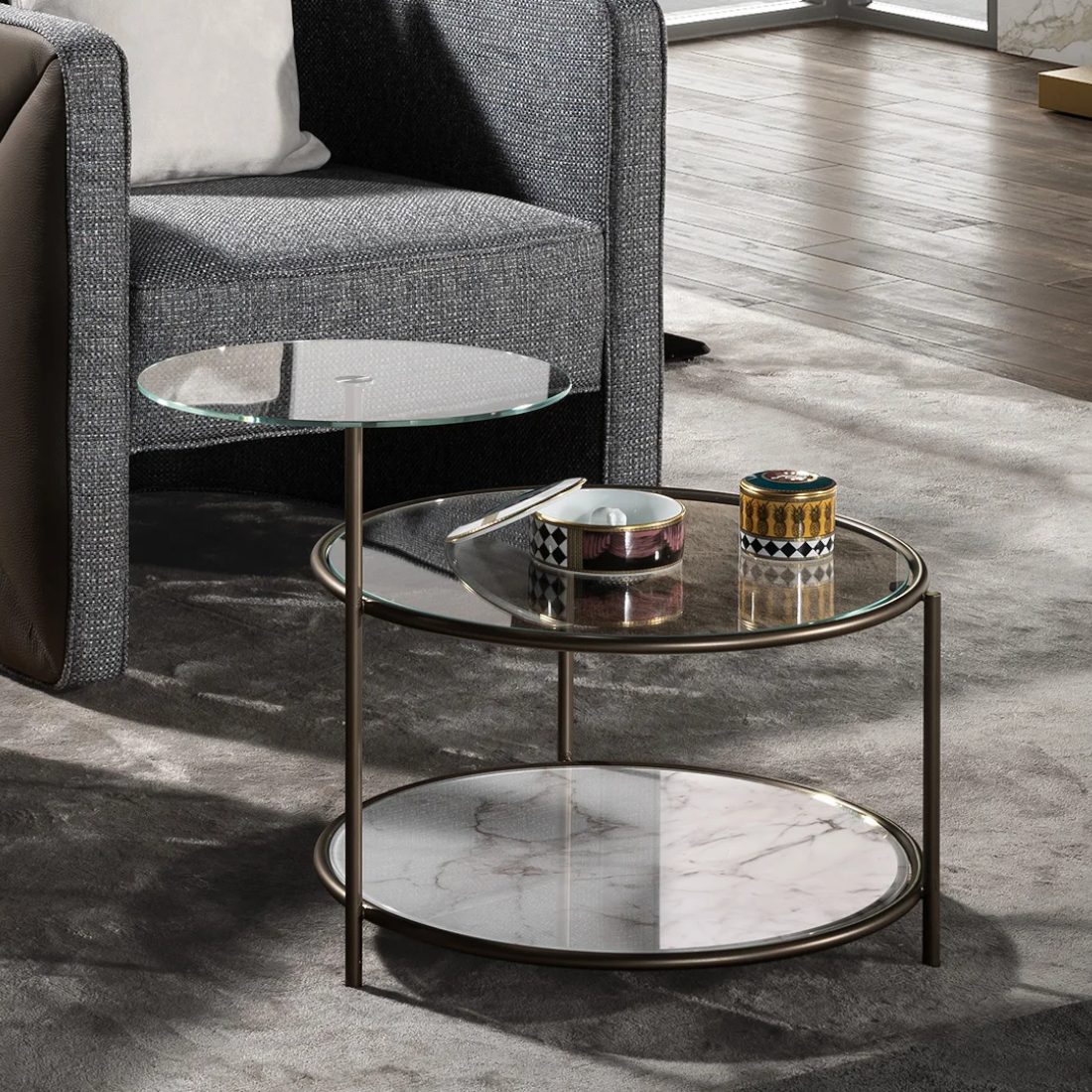 This side table features a bronze-finished metal structure with 5mm thick extra-clear transparent glass for the top and middle shelves. The bottom plate is available in marble or wood-effect glass.