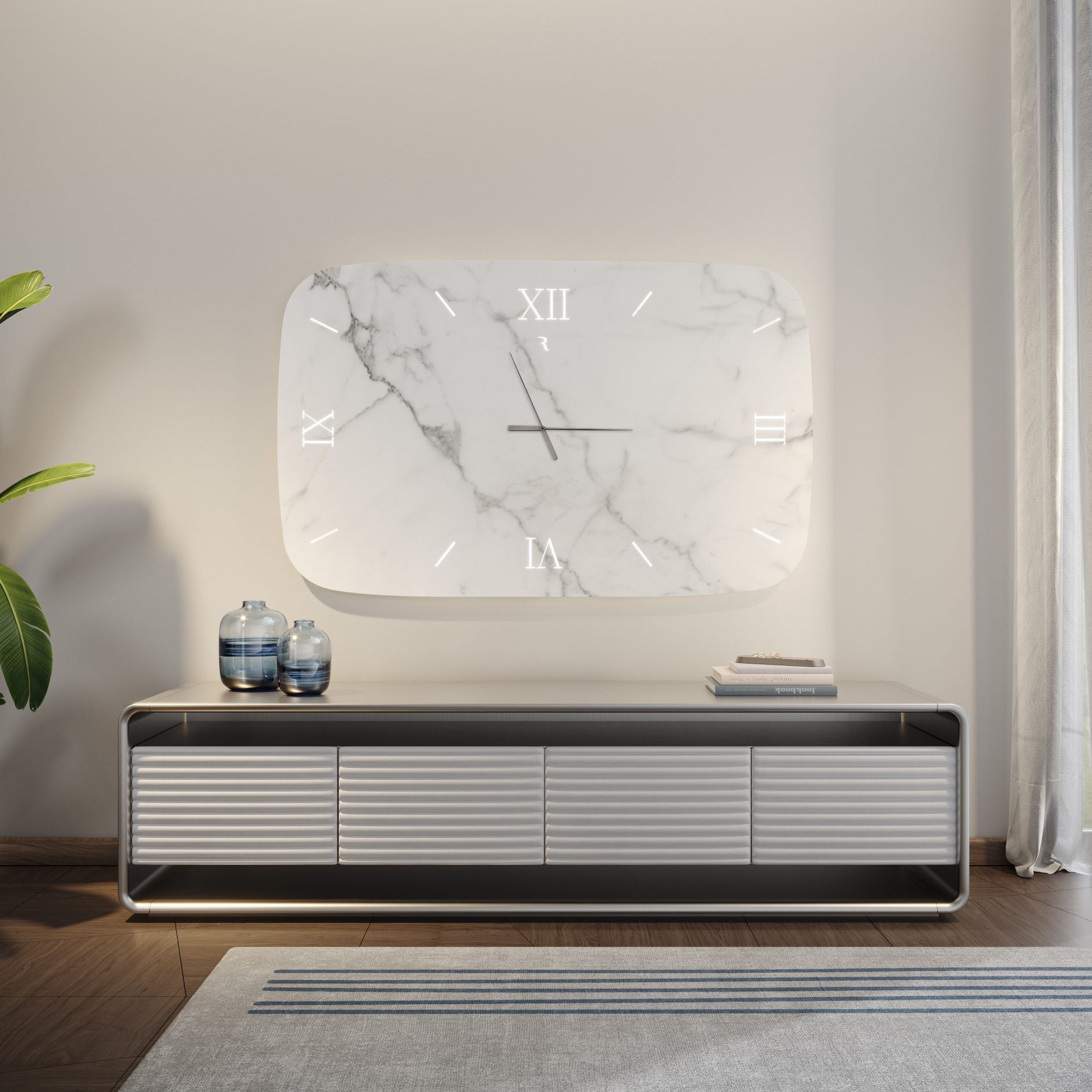 This clock features a 5mm thick glass face with matt Calacatta marble effect glass finish. It showcases Roman numerals in white sandblasted serigraphy and hands in a titanium finish, with optional back LED lighting available.