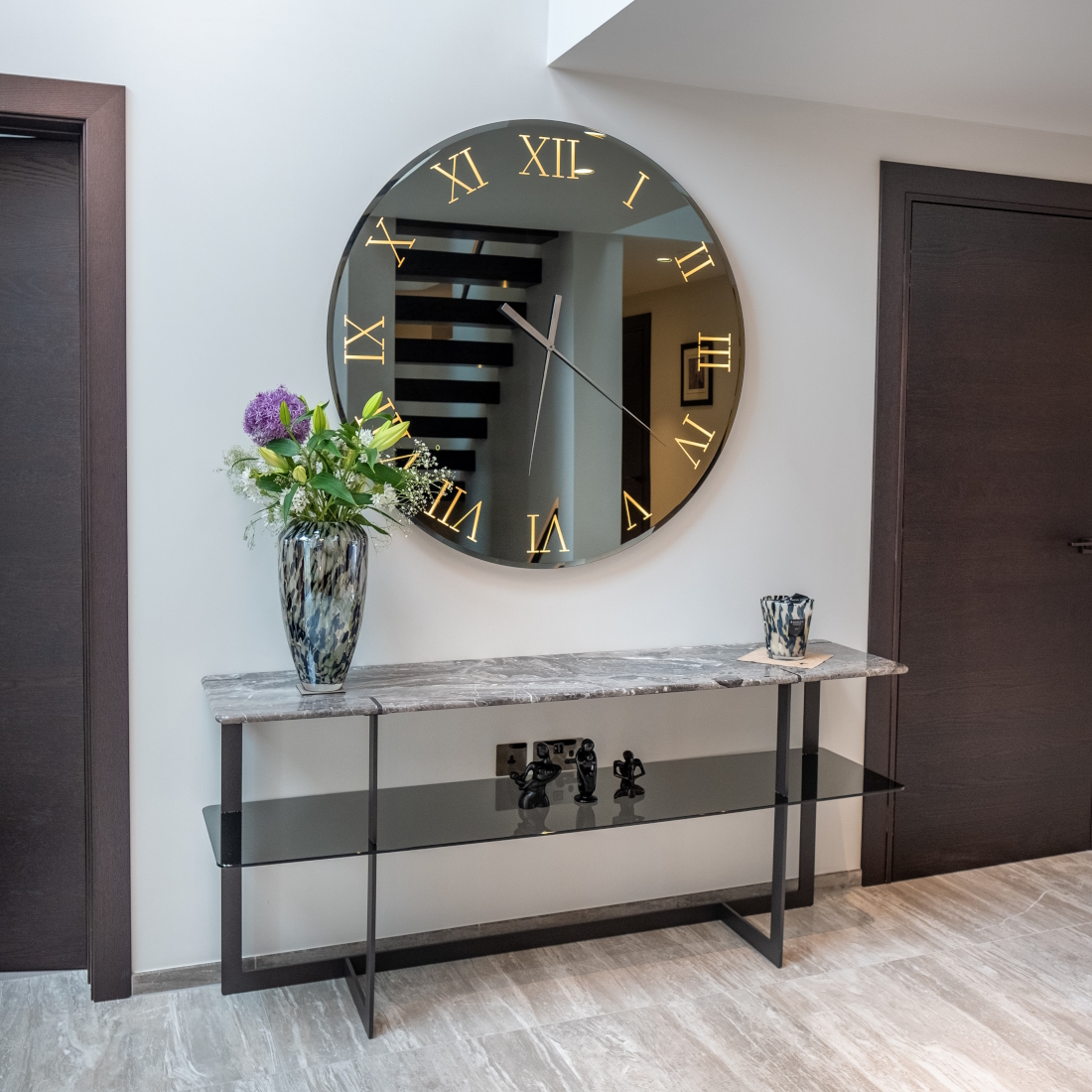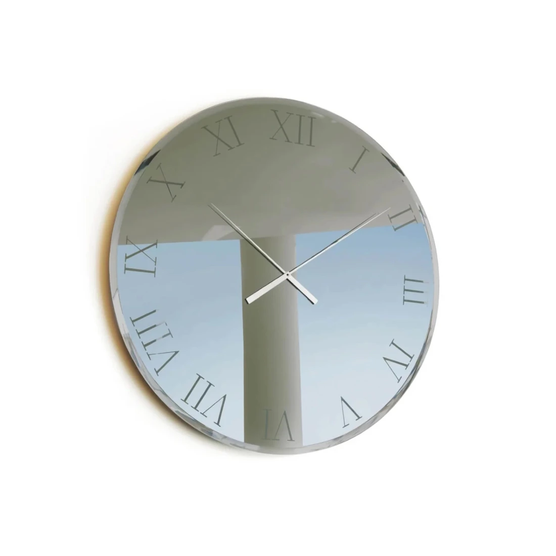 This clock is crafted from 5mm thick extra-clear or smoked mirror glass with a 20mm bevel. It features Roman numerals in smoke-grey serigraphy and titanium hands. Optional back LED lighting is available.