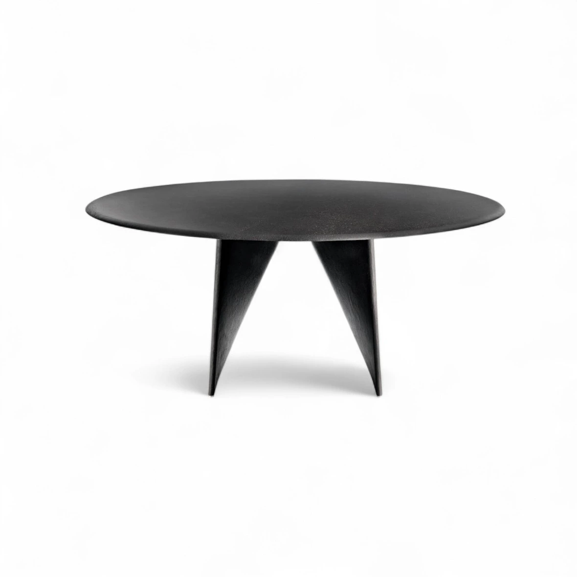 In its Terrae edition, the entire table is hand-finished with a textured surface achieved through artisanal application—soft to the touch yet visually substantial. An integrated steel ballast within the base ensures stability, while the continuous single-material finish accentuates its monolithic presence. A designer round dining table where surface craft meets structural elegance.