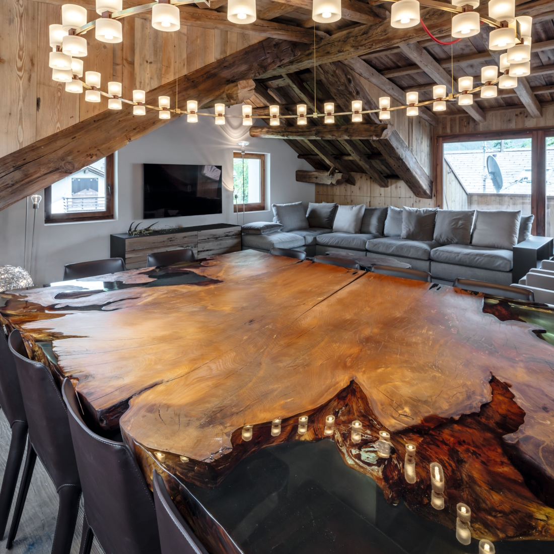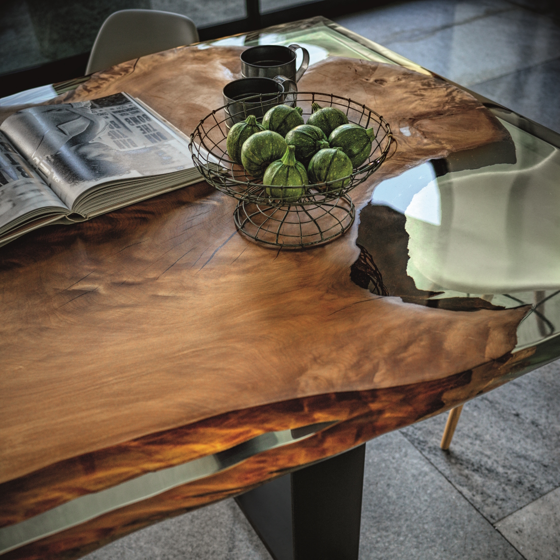 Suspended above a U-shaped iron base, the Newton Kauri dining table by Riva1920 reveals a surface where time and transparency converge. Crafted from 50,000-year-old reclaimed Kauri wood, the tabletop features natural voids filled with transparent resin—capturing a sense of geological stillness within a precise, contemporary frame.