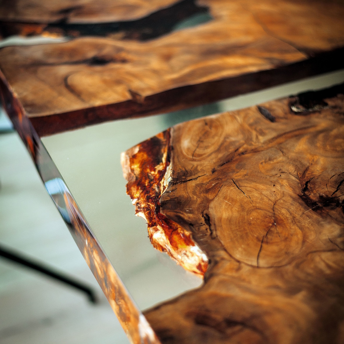 The tabletop is crafted from solid Kauri wood and paired with a U-shaped iron base available in a choice of finishes. Each tabletop is unique, allowing you to select the specific slab of Kauri wood to be used in production, with the option to include transparent resin.