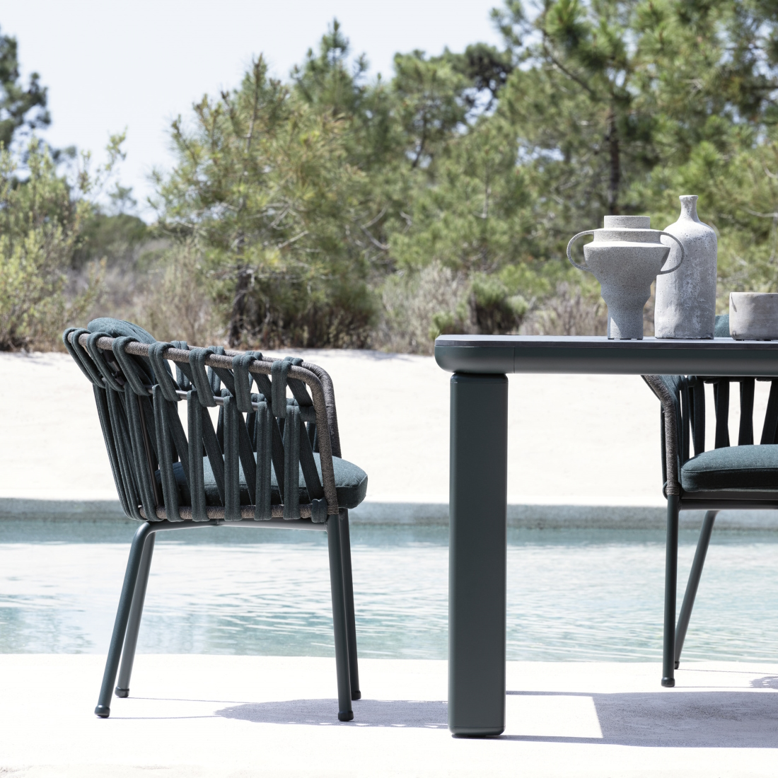 Echoing the contours of a corolla, the Emma Cross dining armchair by Varaschin introduces sculptural enclosure to outdoor dining terraces and garden pavilions. Its backrest features a diagonal weave of acrylic fabric band layered over rope, creating a refined interplay of texture and transparency across the powder-coated aluminium frame.