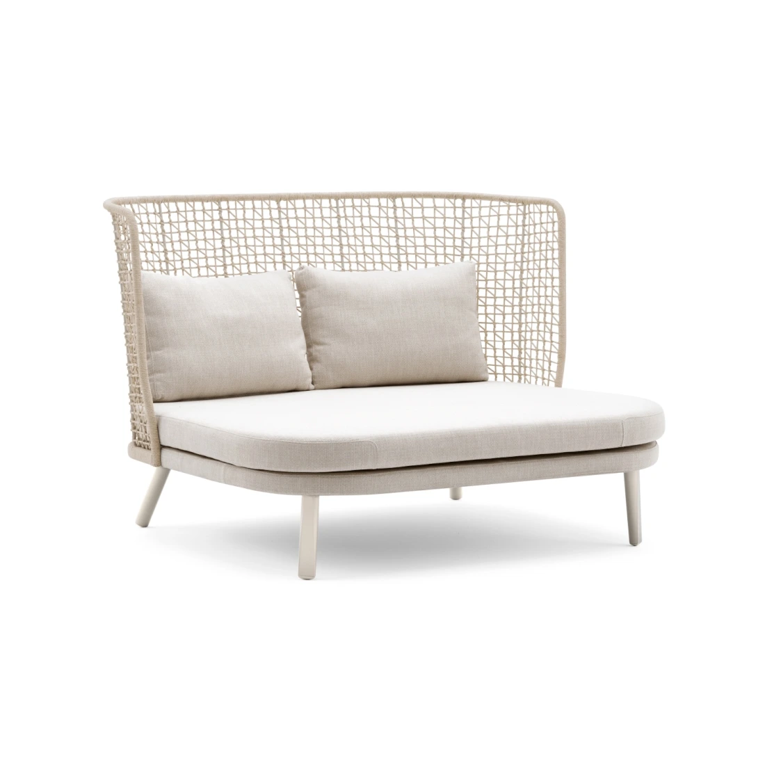 Blending the repose of a sunbed with the embrace of a high-back sofa, the Emma daybed by Varaschin introduces a sculptural retreat to terraces, garden lounges, and poolside decks. Its tall, handwoven backrest—crafted from polypropylene rope—traces a protective arc, offering visual shelter and textured transparency.