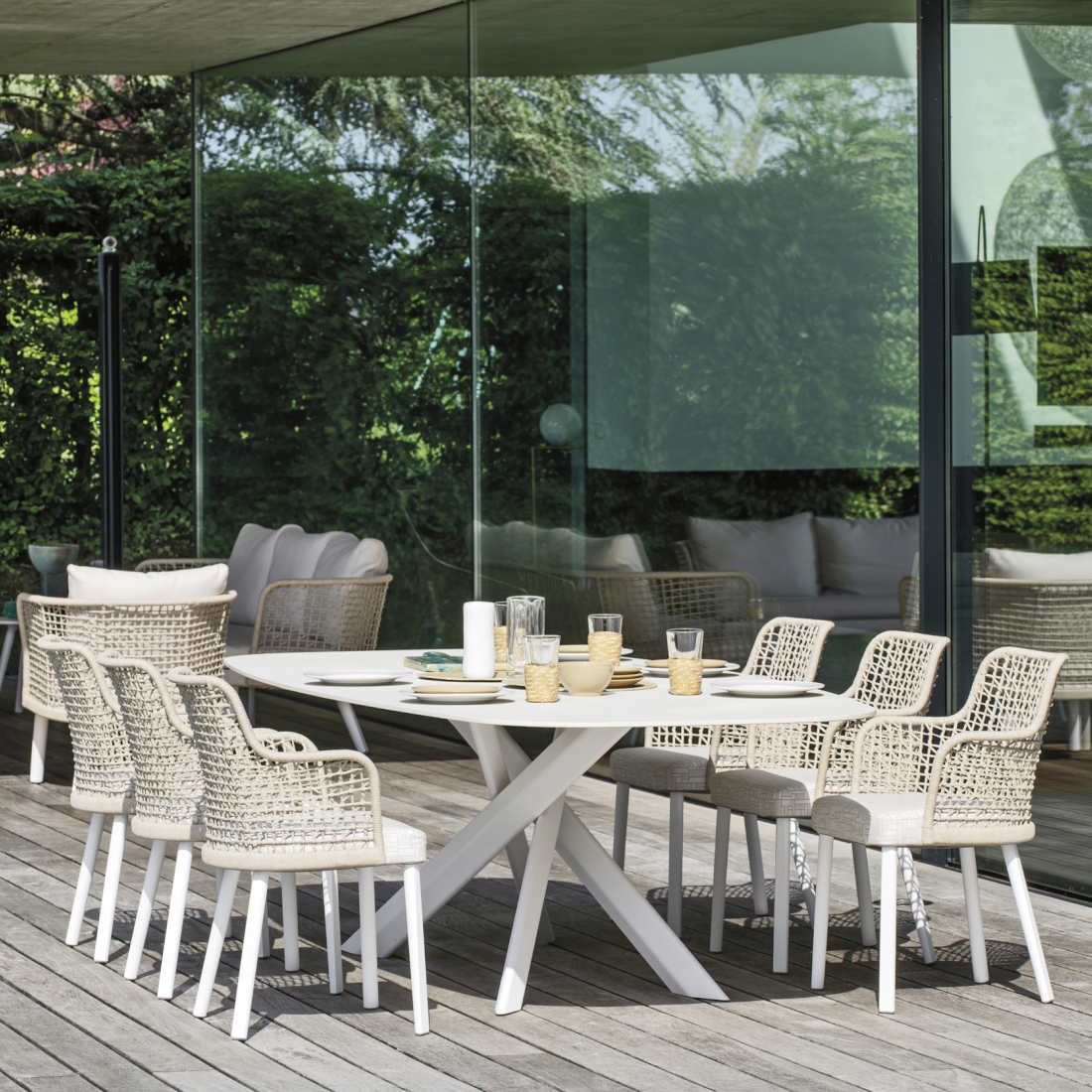 Defined by its tactile backrest and refined proportions, the Emma dining armchair by Varaschin brings sculptural texture to terraces, garden settings, and alfresco dining spaces. The moulded polypropylene seat is designed for optimal drainage, while the powder-coated aluminium backrest is handwoven in durable polypropylene rope—balancing structure with artisanal softness.