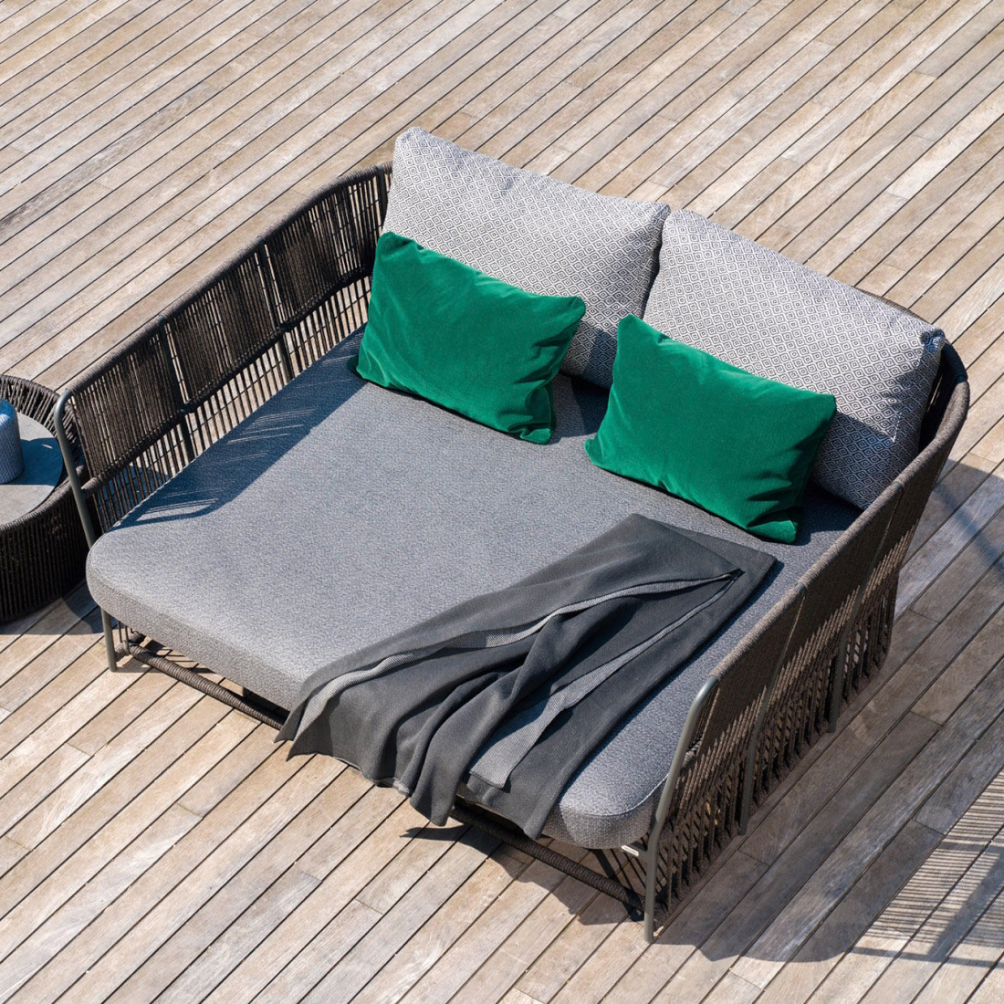 Designed for durability in outdoor settings, this piece includes two large back cushions and can be further customised with smaller scatter cushions. Upholstered in a curated selection of weatherproof fabrics and padded with Dryfeel® foam, the daybed resists UV rays and moisture. Favoured by architects for residential rooftops, boutique hotel terraces, and quiet garden enclaves, the Tibidabo compact daybed balances lightness, comfort, and architectural presence.